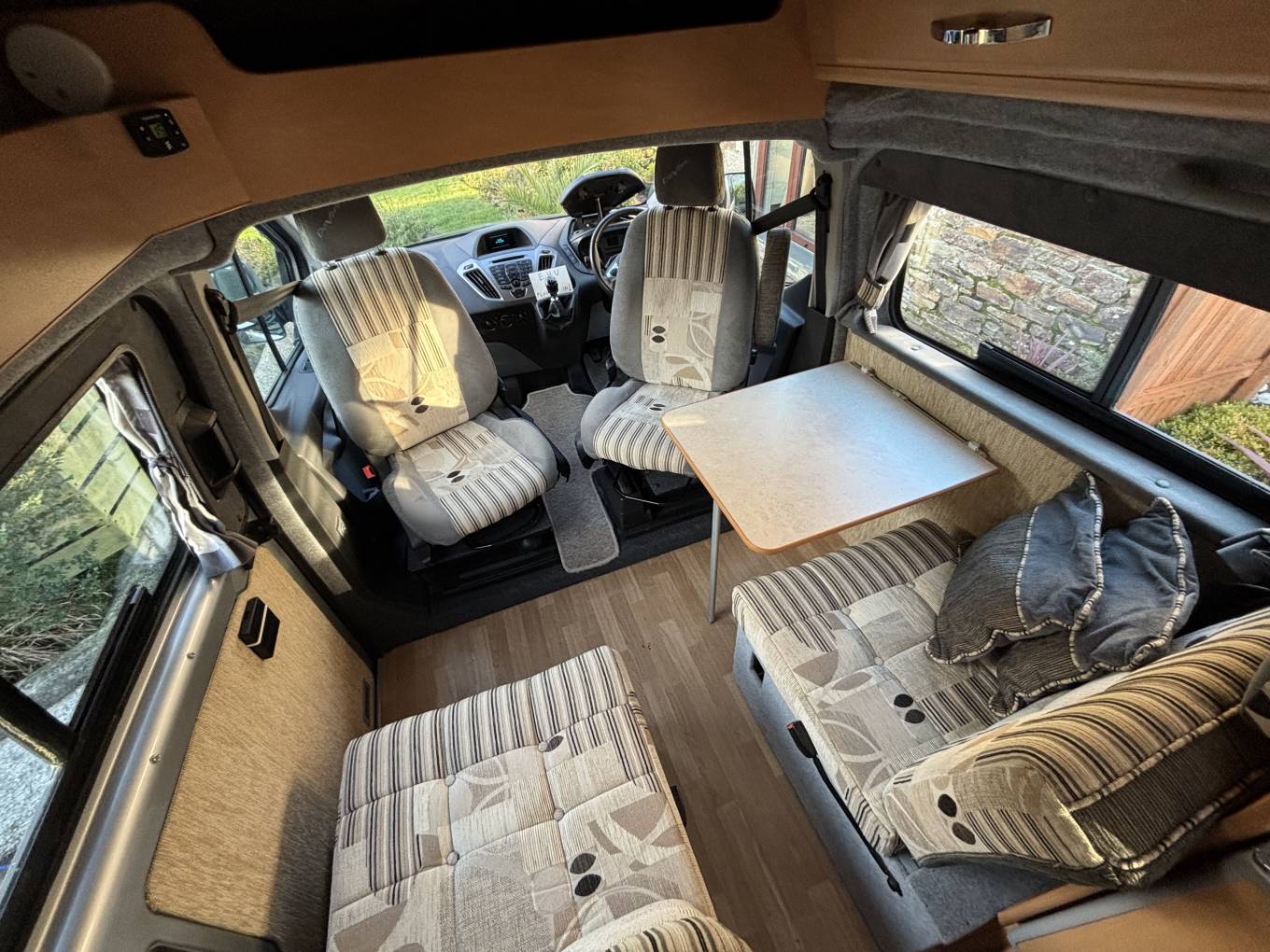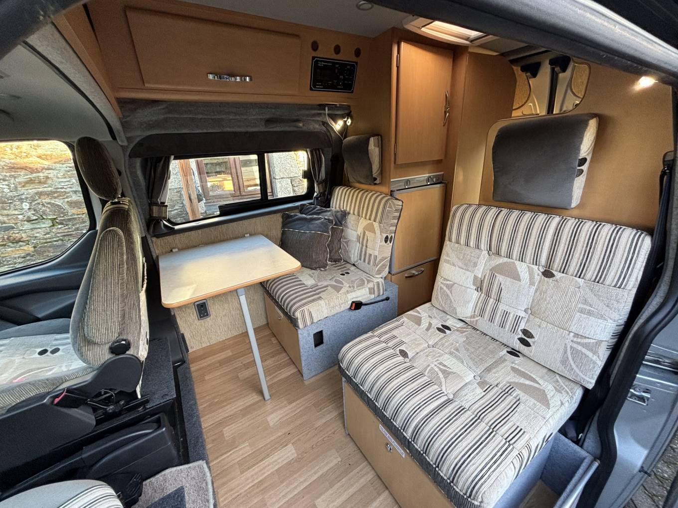 The camper comes very well spec'd and includes – Hard Top Roof, Solar Panel, Cab Air Con, Leisure Battery, Hook Up Point with Cable, Reverse Sensors, Gas Bottle, Electric Windows and Mirrors, USB points in the Front and Rear, 240 sockets in the Rear, Both Single Front Seats Swivel into the living area, Table for the Living Area, Silver Screens, Eberspacher Diesel Heater, 2 Sets of Keys.