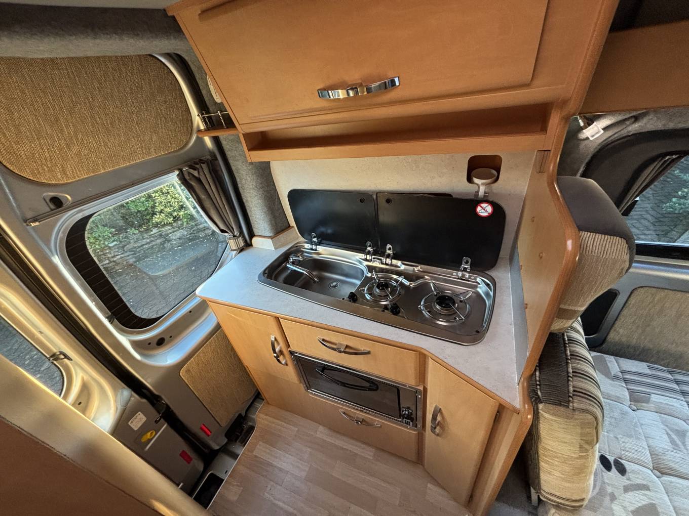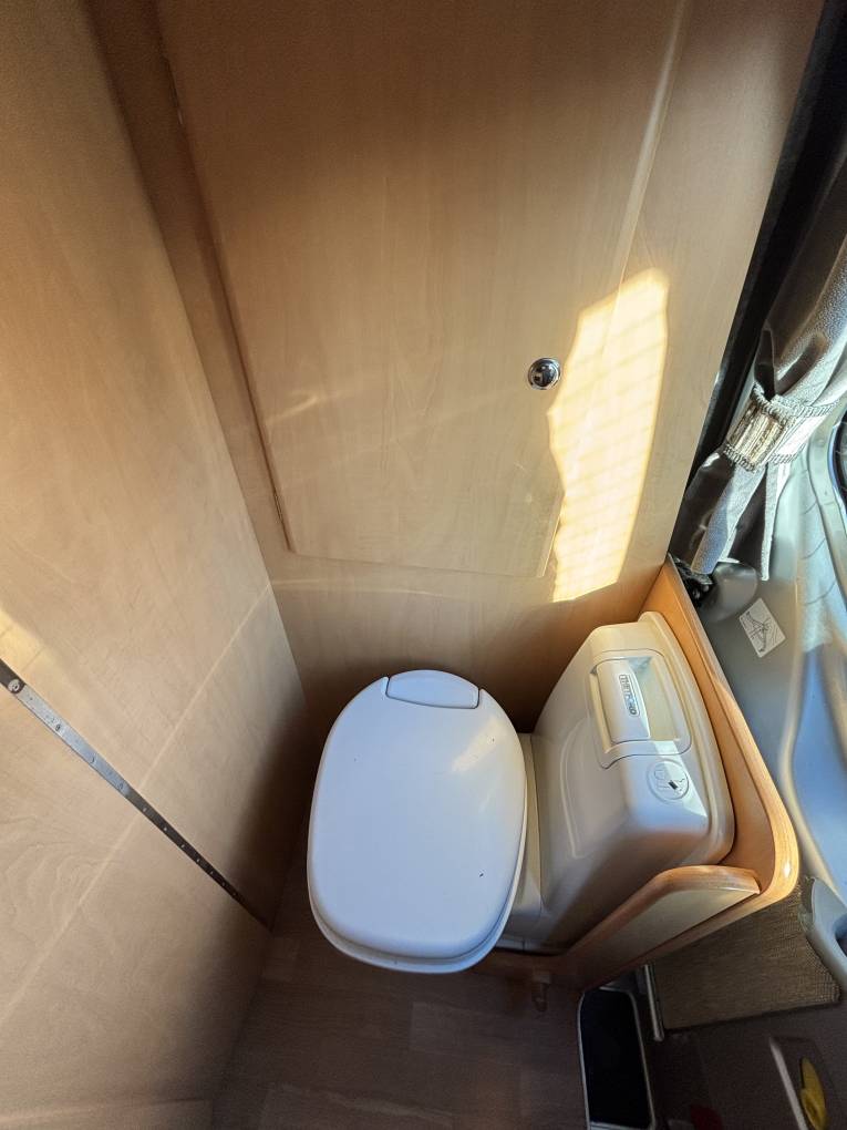 At the rear of the camper you have a kitchen with a 2-Gas burner, Oven & Grill and Wash basin as well as a cleverly hidden away Toilette Cassette on the opposite side of the van along with a storage cupboard and 3-way fridge.