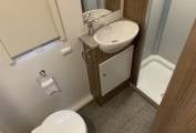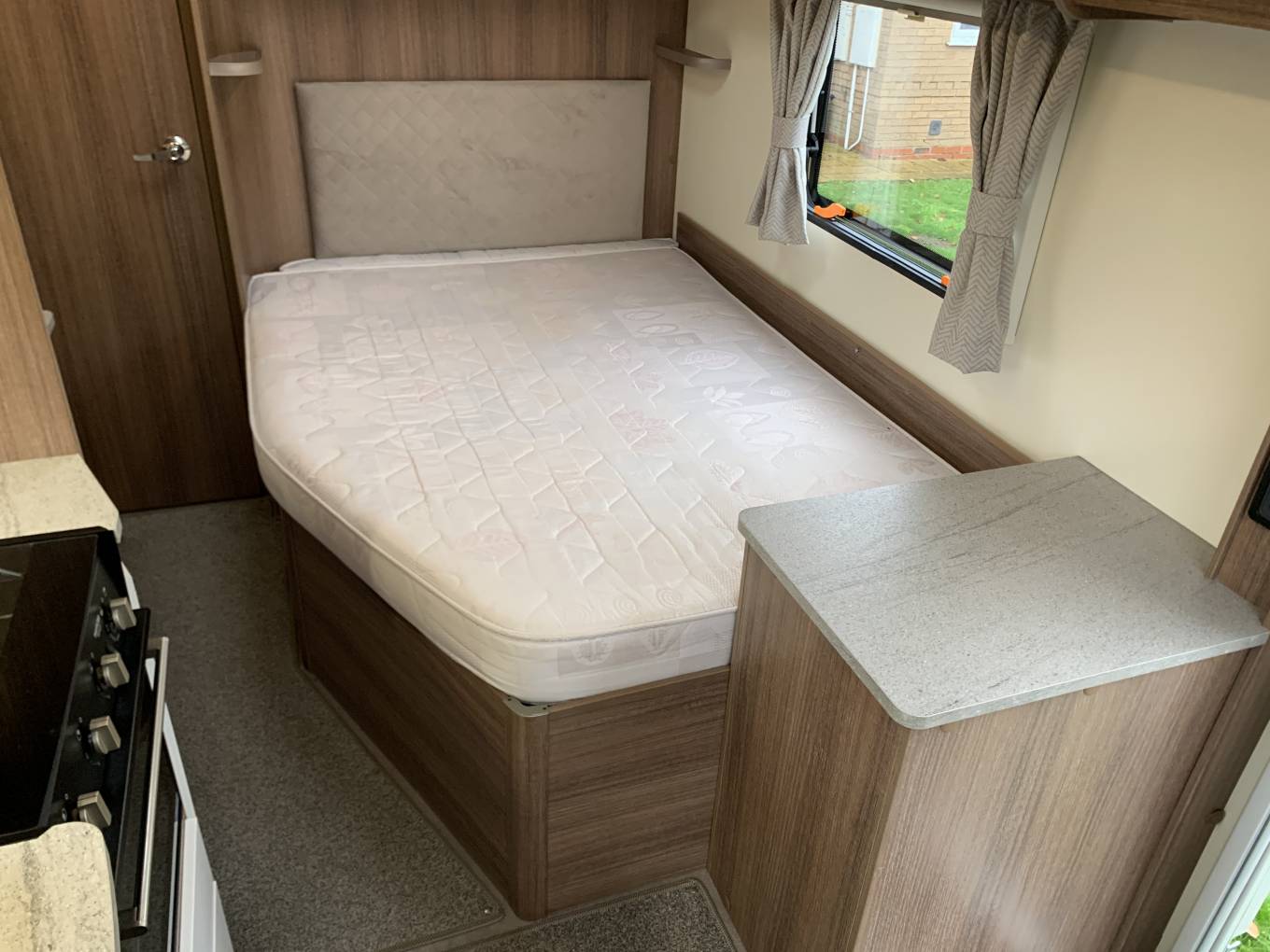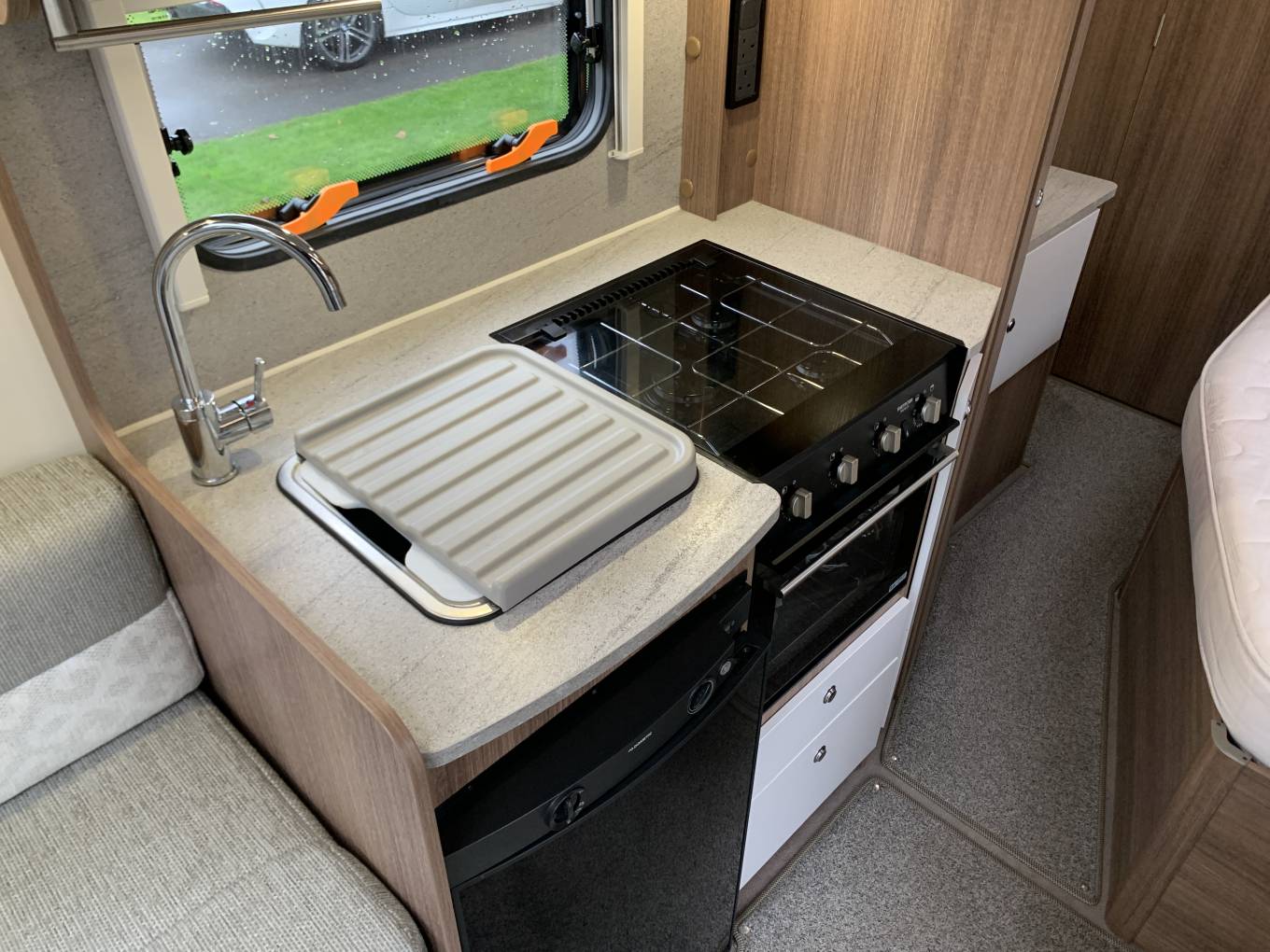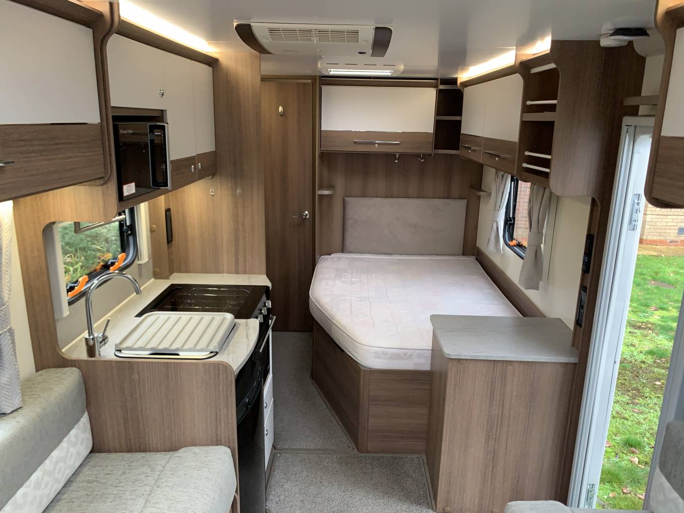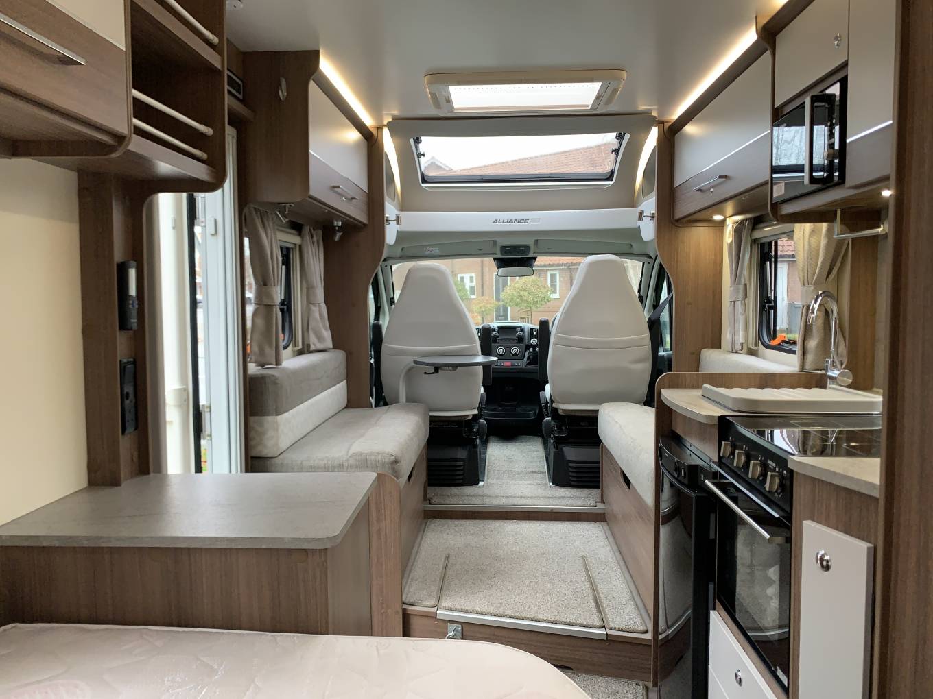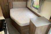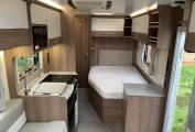 Layout comprises a full width rear wash/changing room, behind a spacious bedroom with built in dressing table and a floor to ceiling wardrobe. The central kitchen is fully equiped with 3 gas hobs, full oven grill, microwave and a dometic fridge freezer, heating and hot water from a Truma inet boiler.