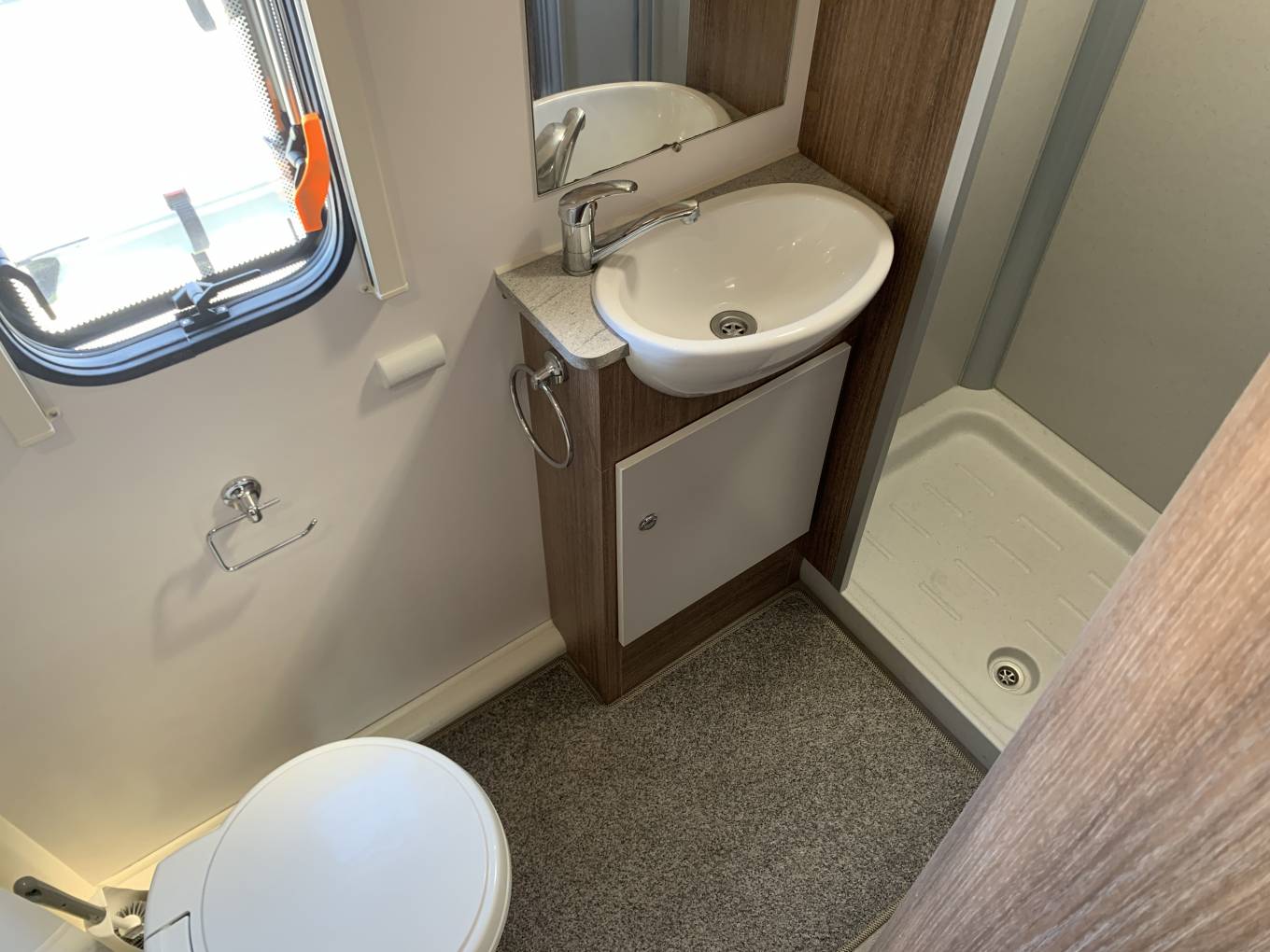Layout comprises a full width rear wash/changing room, behind a spacious bedroom with built in dressing table and a floor to ceiling wardrobe. The central kitchen is fully equiped with 3 gas hobs, full oven grill, microwave and a dometic fridge freezer, heating and hot water from a Truma inet boiler.