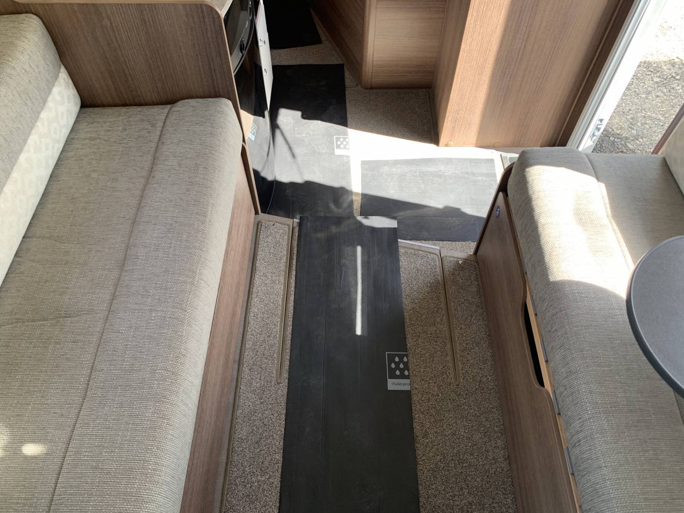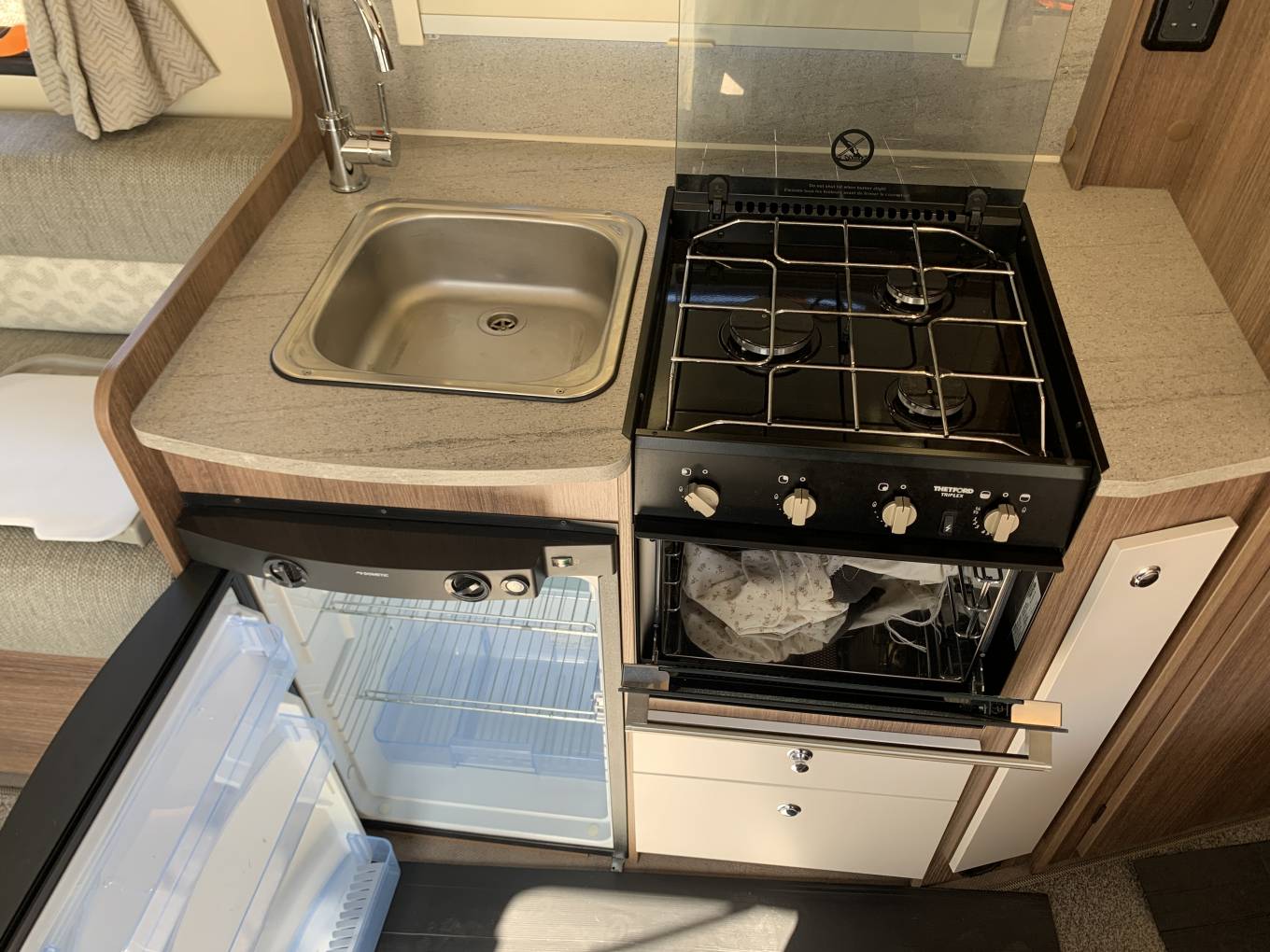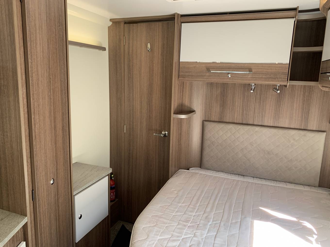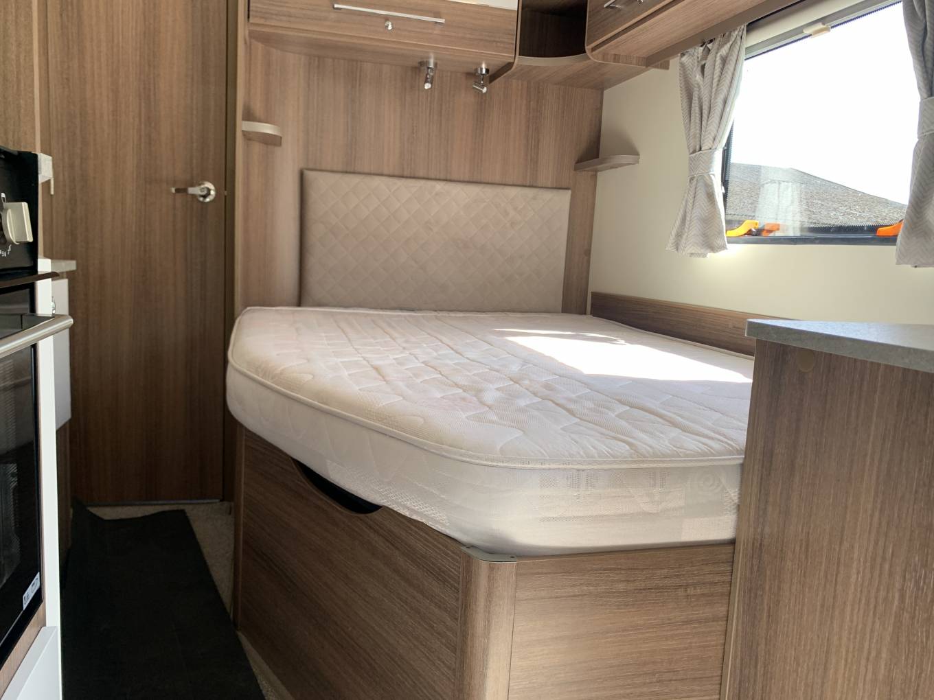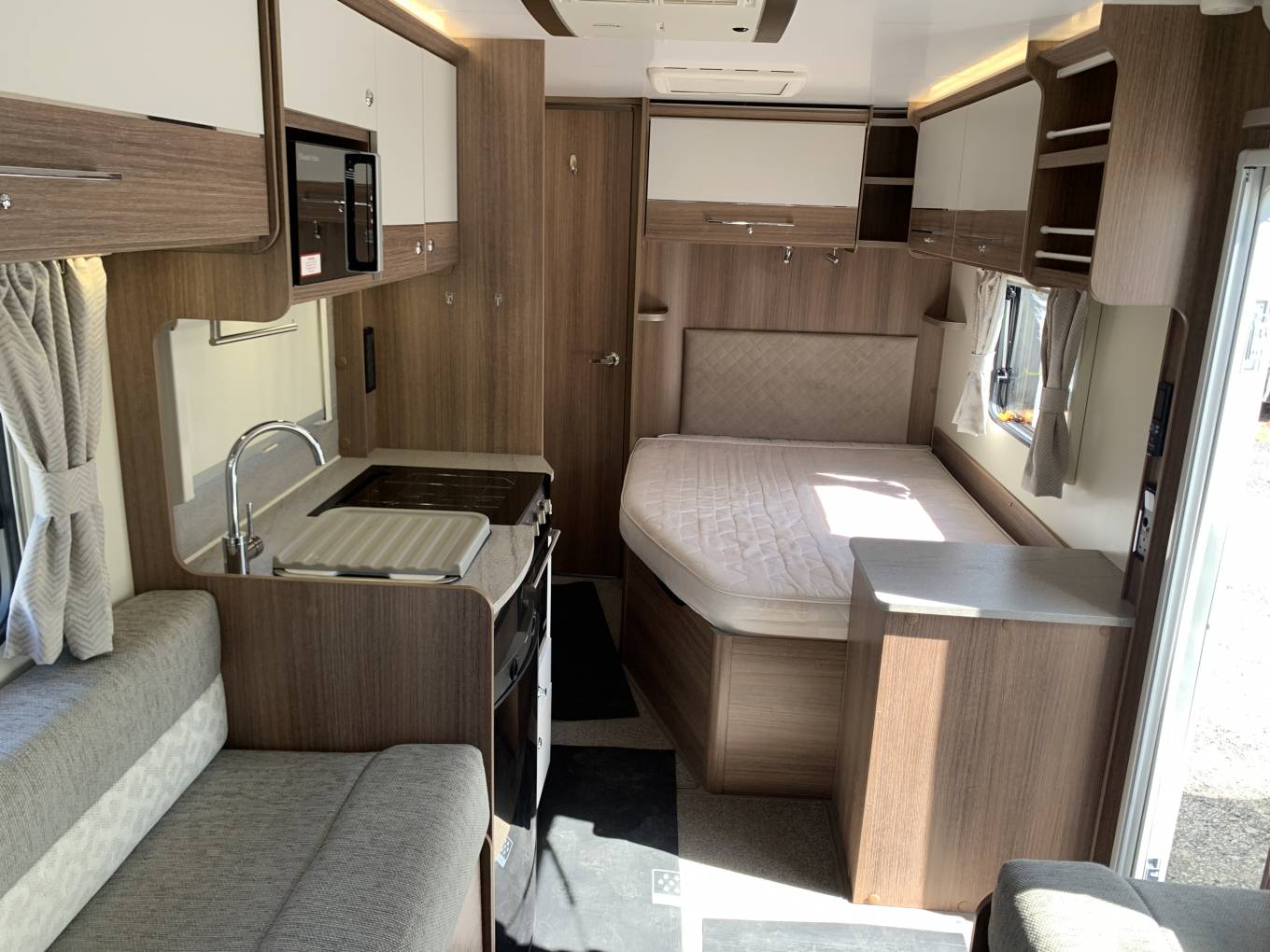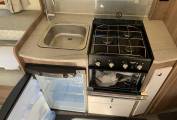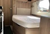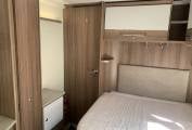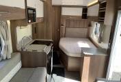 Layout comprises a full width rear wash/changing room, behind a spacious bedroom with built in dressing table and a floor to ceiling wardrobe. The central kitchen is fully equiped with 3 gas hobs, full oven grill, microwave and a dometic fridge freezer, heating and hot water from a Truma inet boiler.