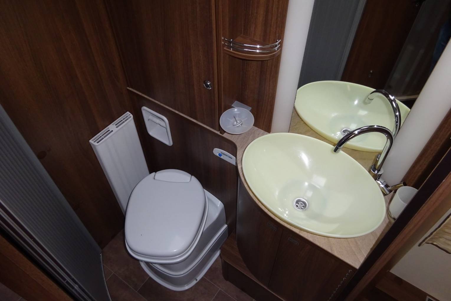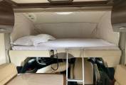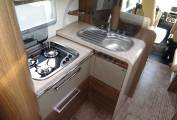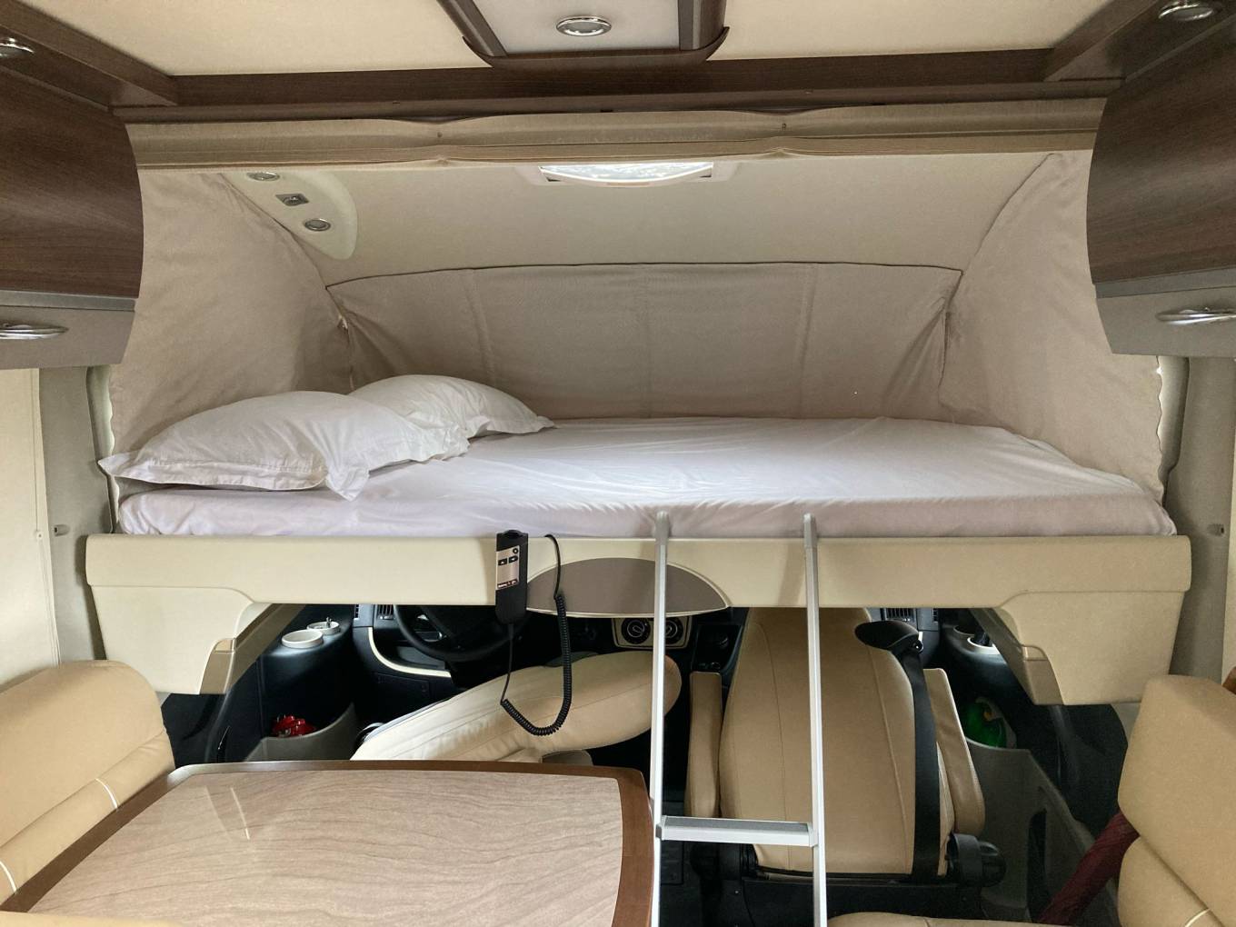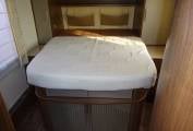 There is comfortable sleeping for up to 4 adults, separated by privacy doors. The contemporary split washroom area has a full size shower cubicle on one side, and the toilet and washbasin, mirror, medicine cabinet and vanity unit on the other. At the rear of the motorhome there is the preferred island bed that incorporates a dressing table with mirror that folds out from under the bed. The bedroom has plenty of storage including a wardrobe and over head cabinets. This is complemented with a large drop down bed at the front of the motorhome. It easily sleeps 4 without having to continually be making up beds. It has the added benefit of the preferred Alde heating system and also has a habitation air conditioning unit.