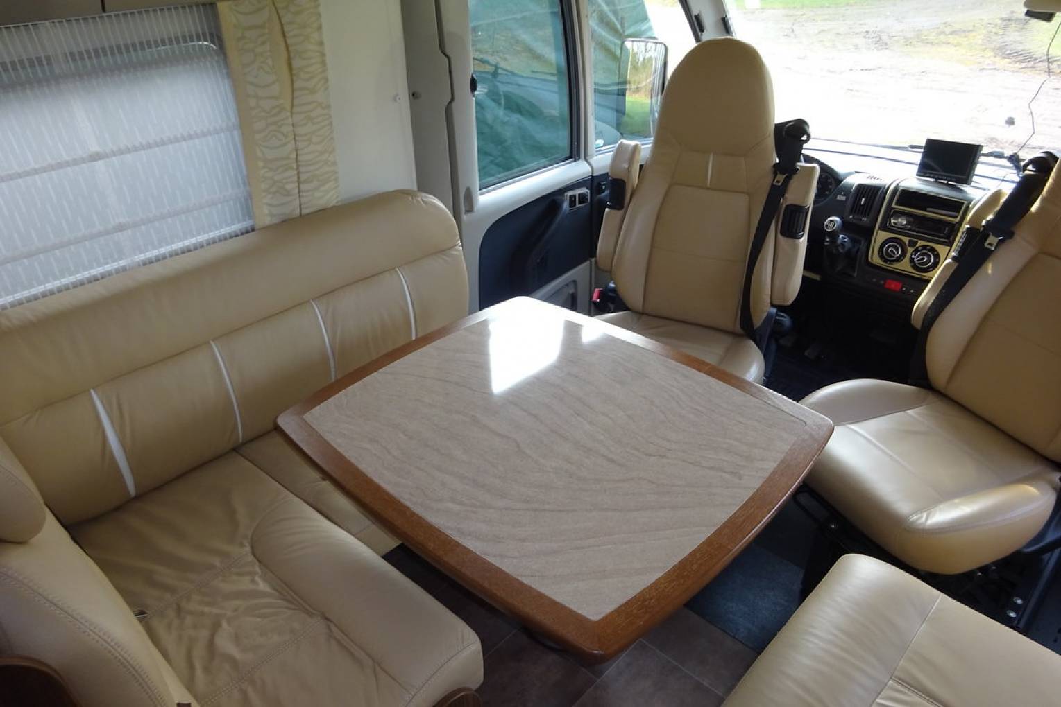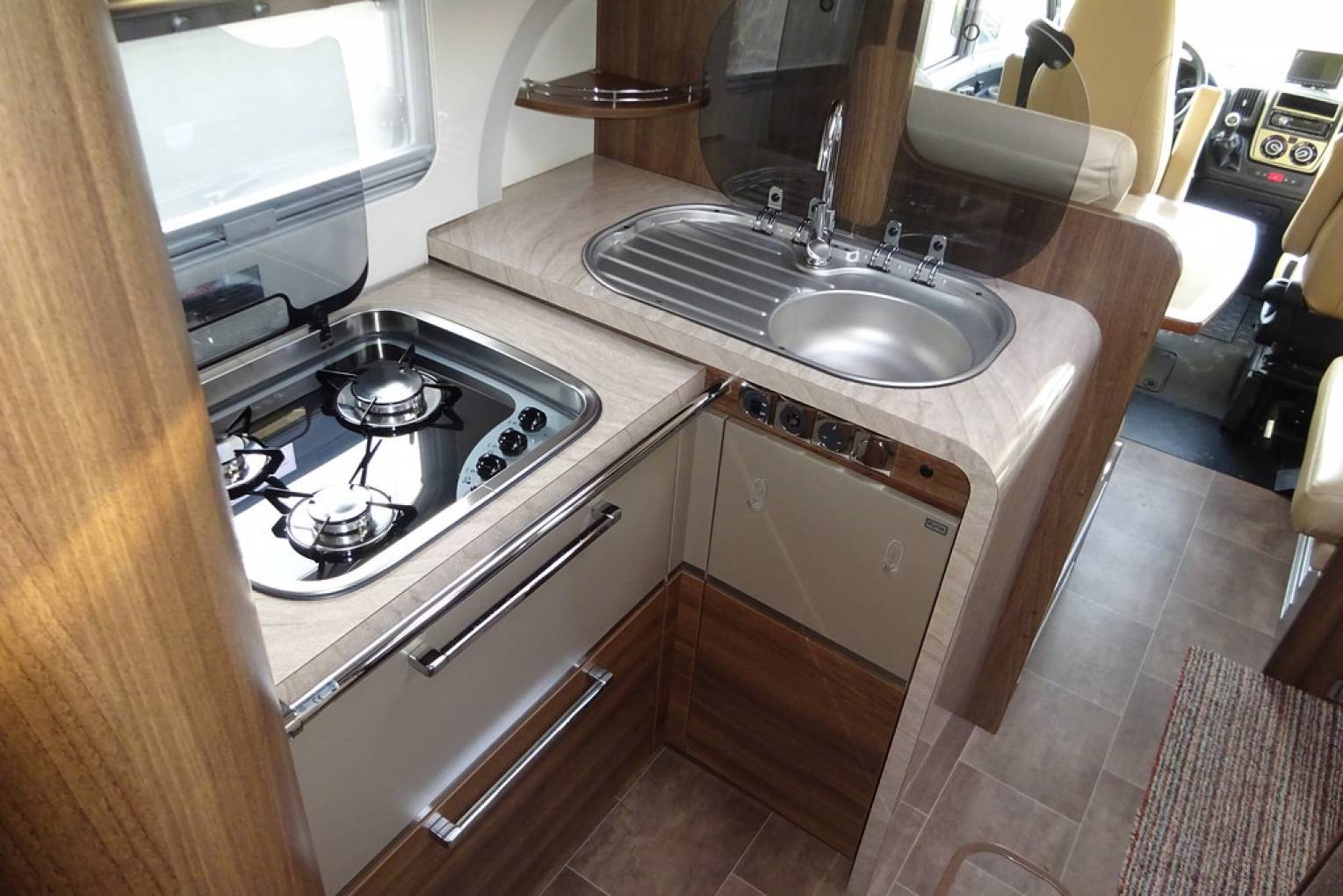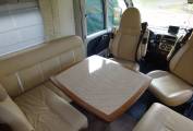 As you enter the motorhome you get a real feeling for the luxury and high quality build that this motorhome has. At the front of the van there is a large seating area finished in full cream leather and with the 2 captains chairs it easily seats 6. The modern kitchen area comprises a three ring gas hob, separate oven and grill, high quality food preparation worktops and sink, mixer tap, and fridge with separate freezer compartment. There is plenty of storage and cupboard space throughout.