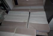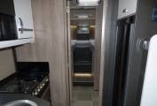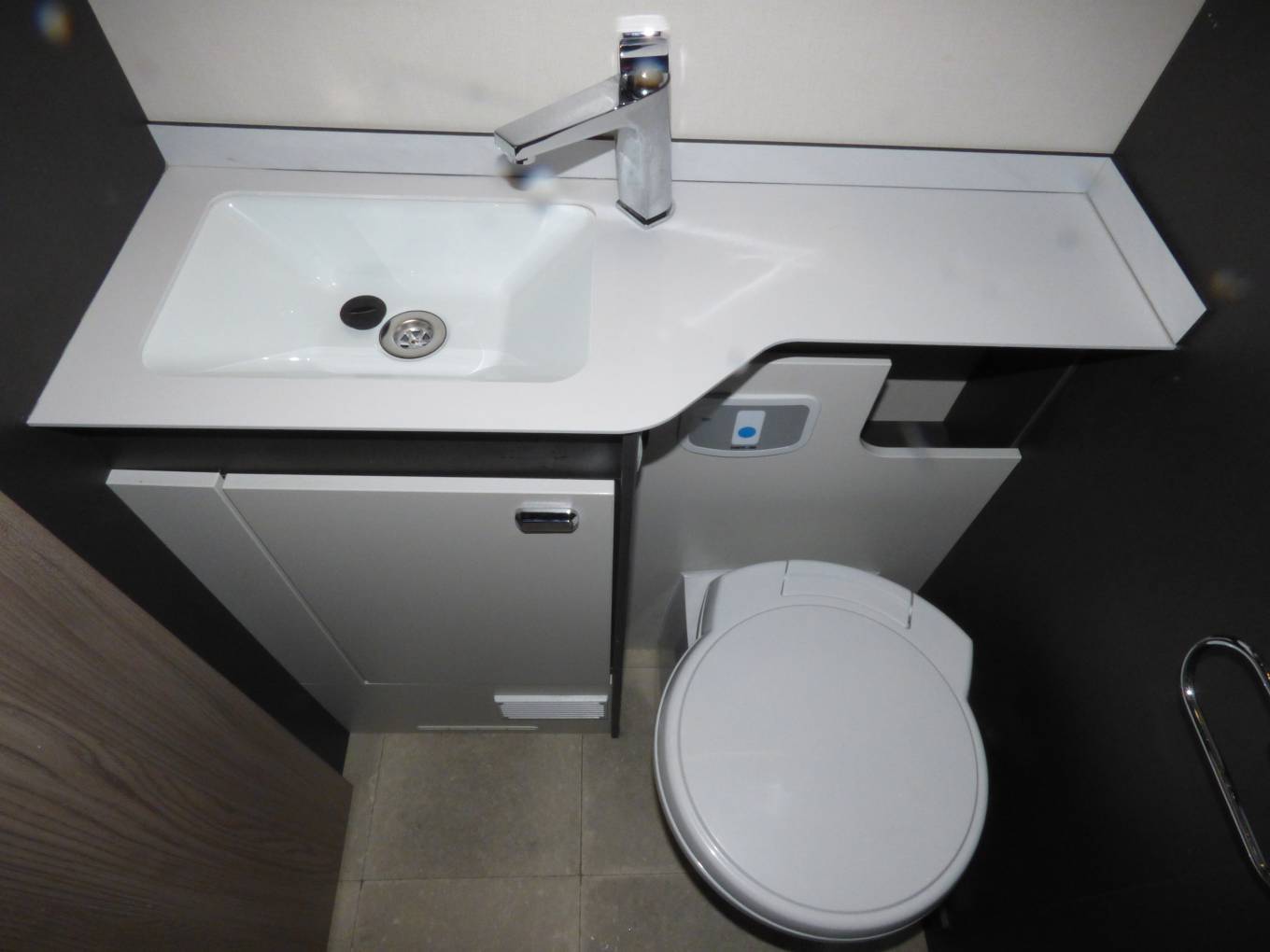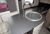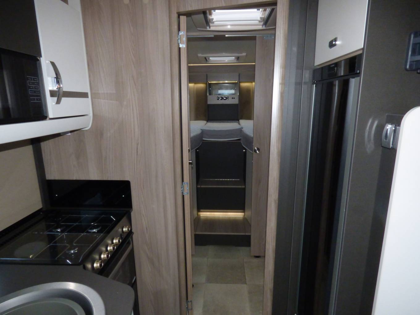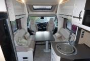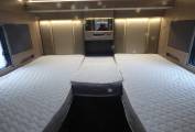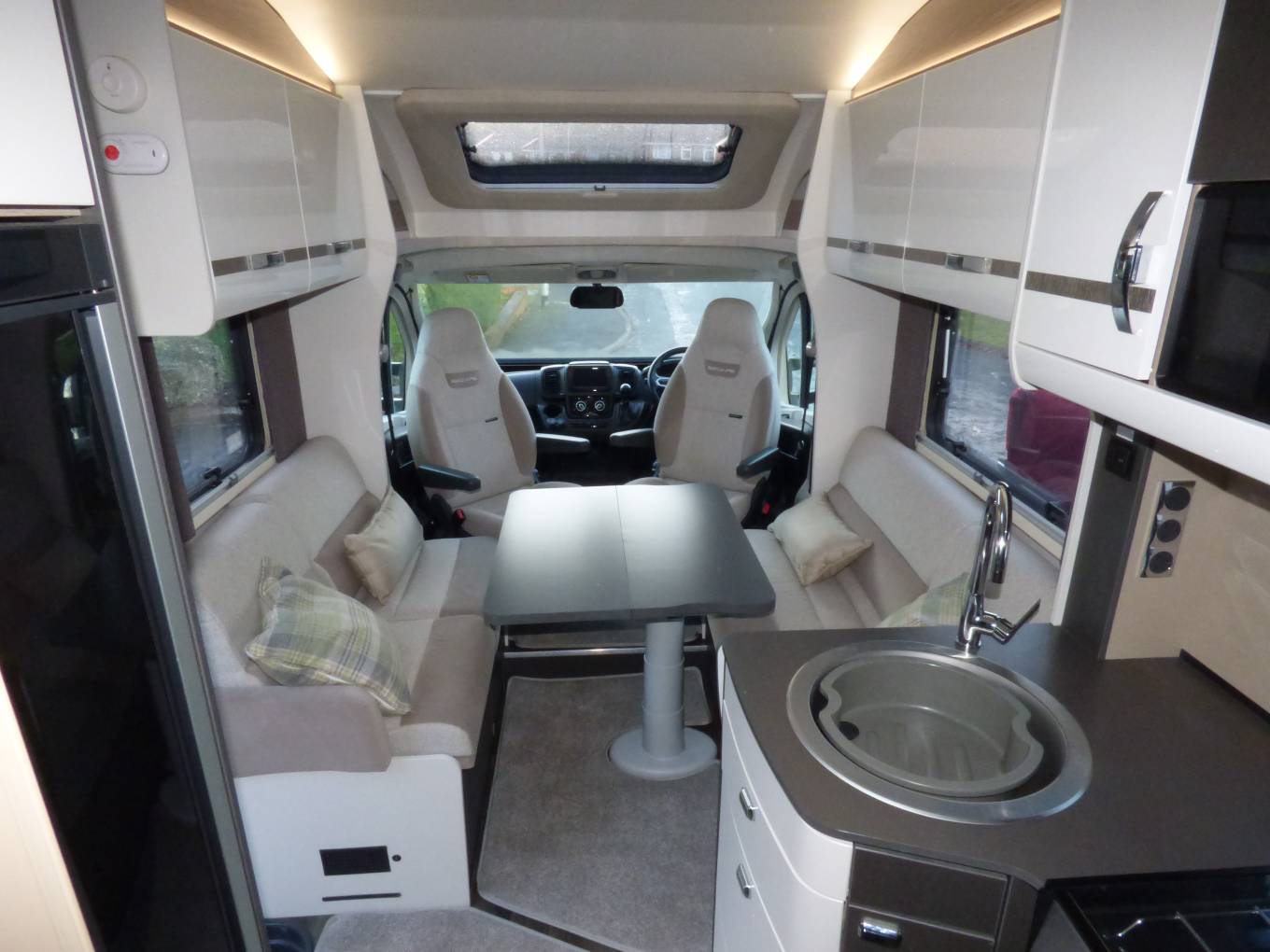 The front seats turn towards the very comfortable dinette area with electric lowering table capable of seating 6 in comfort. The bench seats and table quickly turn into a double bed. The rear bedroom has two long singles with ample storage underneath on both sides of the motorhome. The vehicle benefits from Alde wet heating. The kitchen area has an extendable work surface with sink, mixer taps, 3 gas and one electric hob, oven and grill combined and microwave oven, opposite a large fridge with freezer compartment.