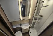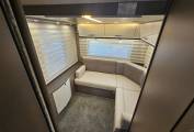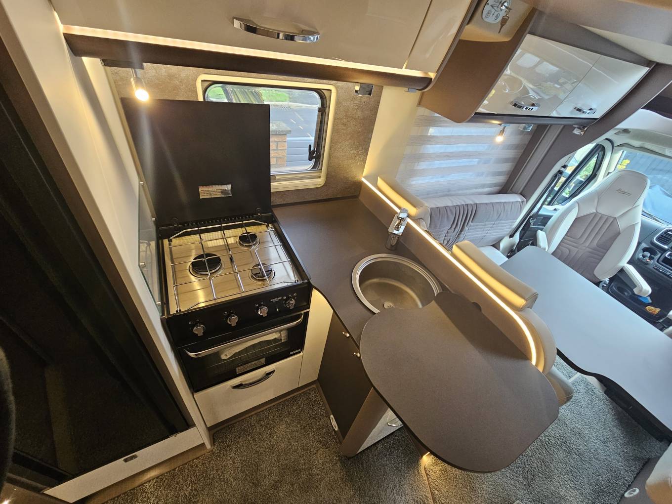 The kitchen is smartly laid out with a three burner gas hob, oven/grill combo, round sink with worktop extension, and ample cupboard storage. It’s ideal for preparing meals on the go, with practical placement and modern finishes. Opposite, you’ll find a generously sized fridge and freezer, giving you everything you need for longer trips.