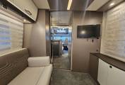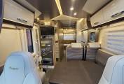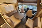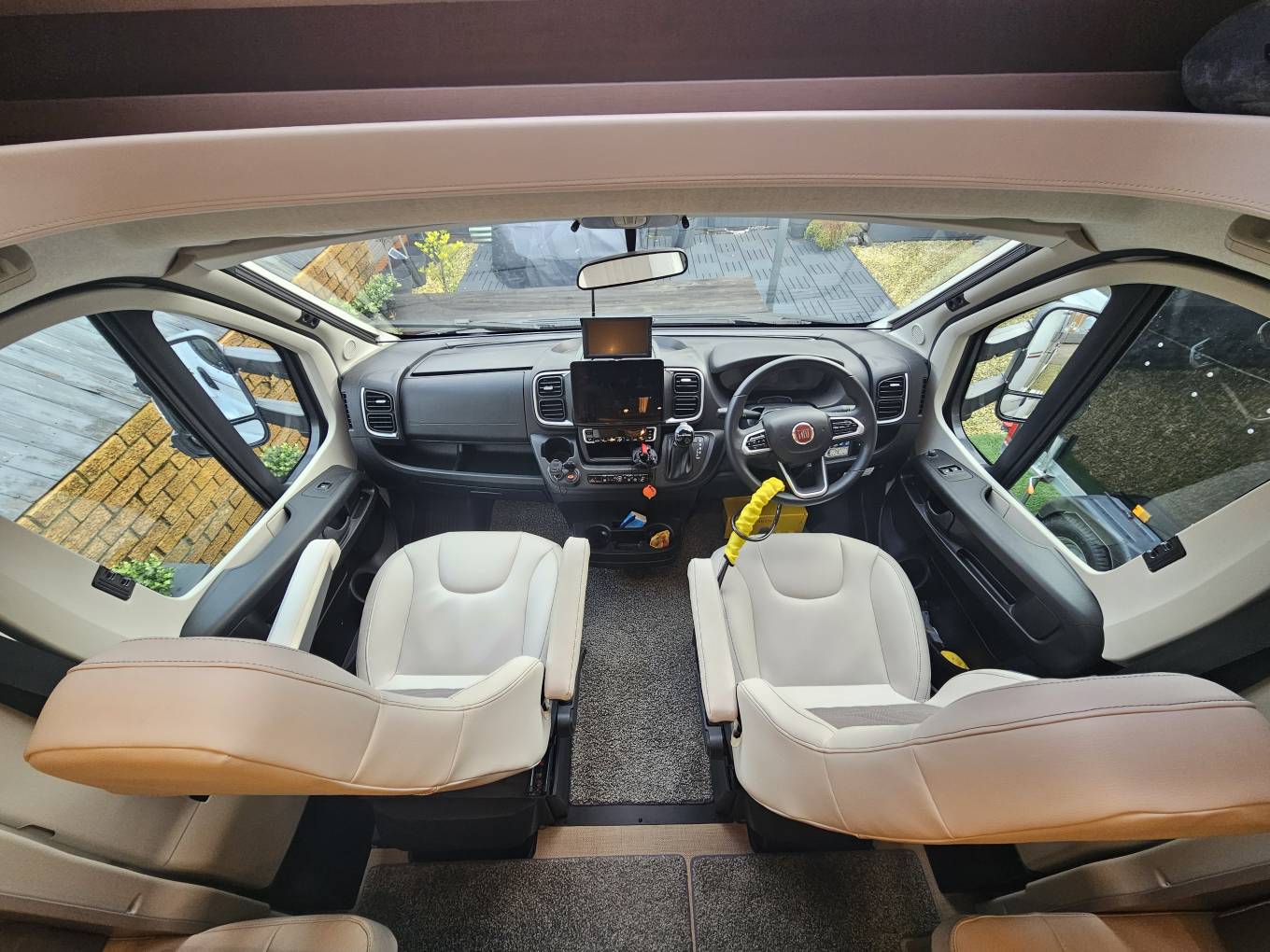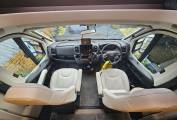 Inside, the layout is spacious and great design. The rear lounge offers a relaxing wraparound seating area with hidden storage beneath the floor and a concealed pull out coffee table, a brilliant touch that maximises space and versatility. At the touch of a button, a dropdown double bed, turning the area into a cosy sleeping space without needing to make up a bed manually. Up front, the central dinette is equally well thought out, with two rear belted travel seats and another drop down double bed overhead, allowing you to comfortably sleep 2 more without compromising daytime space and sleeps another 2 underneath in the dinette conversion with a total of 6 berth.. Both the captain’s chairs swivel to face the lounge.