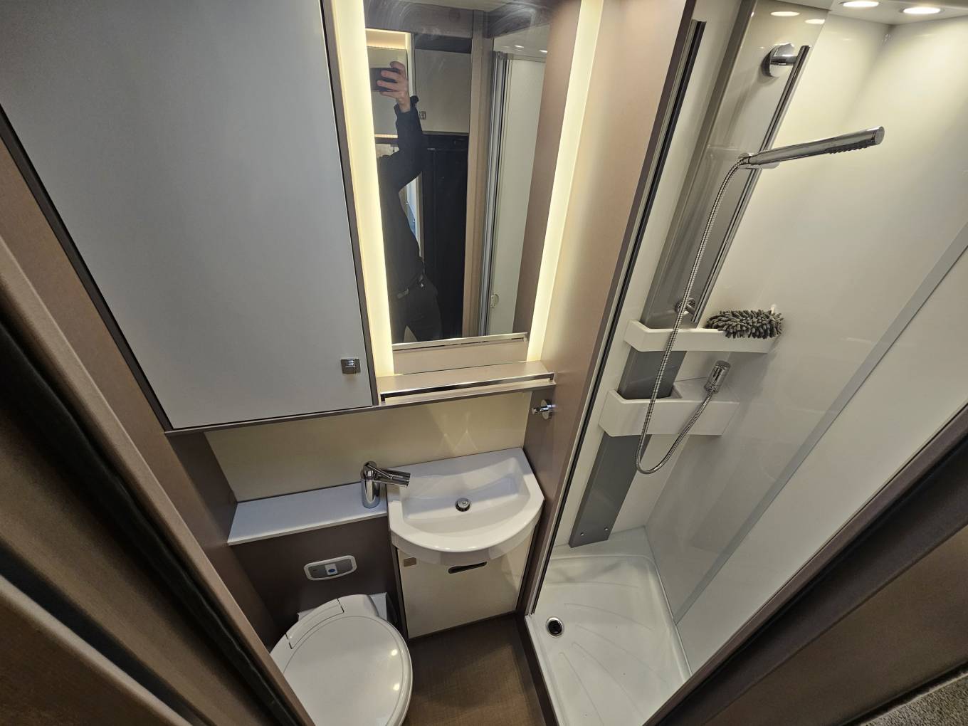 The washroom features a separate shower cubicle with full size door, LED lighting, mirrored vanity, toilet, sink, and a surprisingly spacious feel. You’ll also find integrated cabinetry and towel storage, continuing the modern aesthetics.