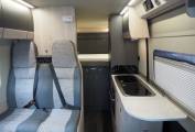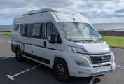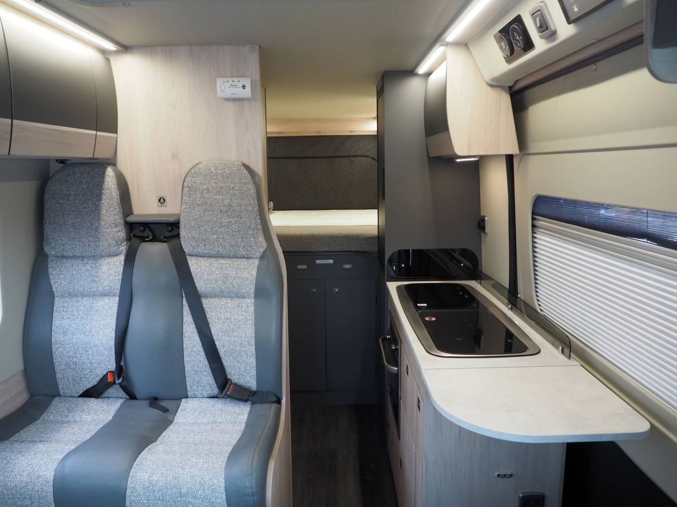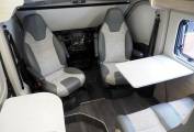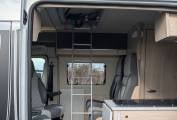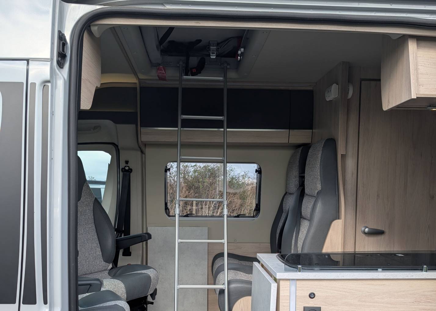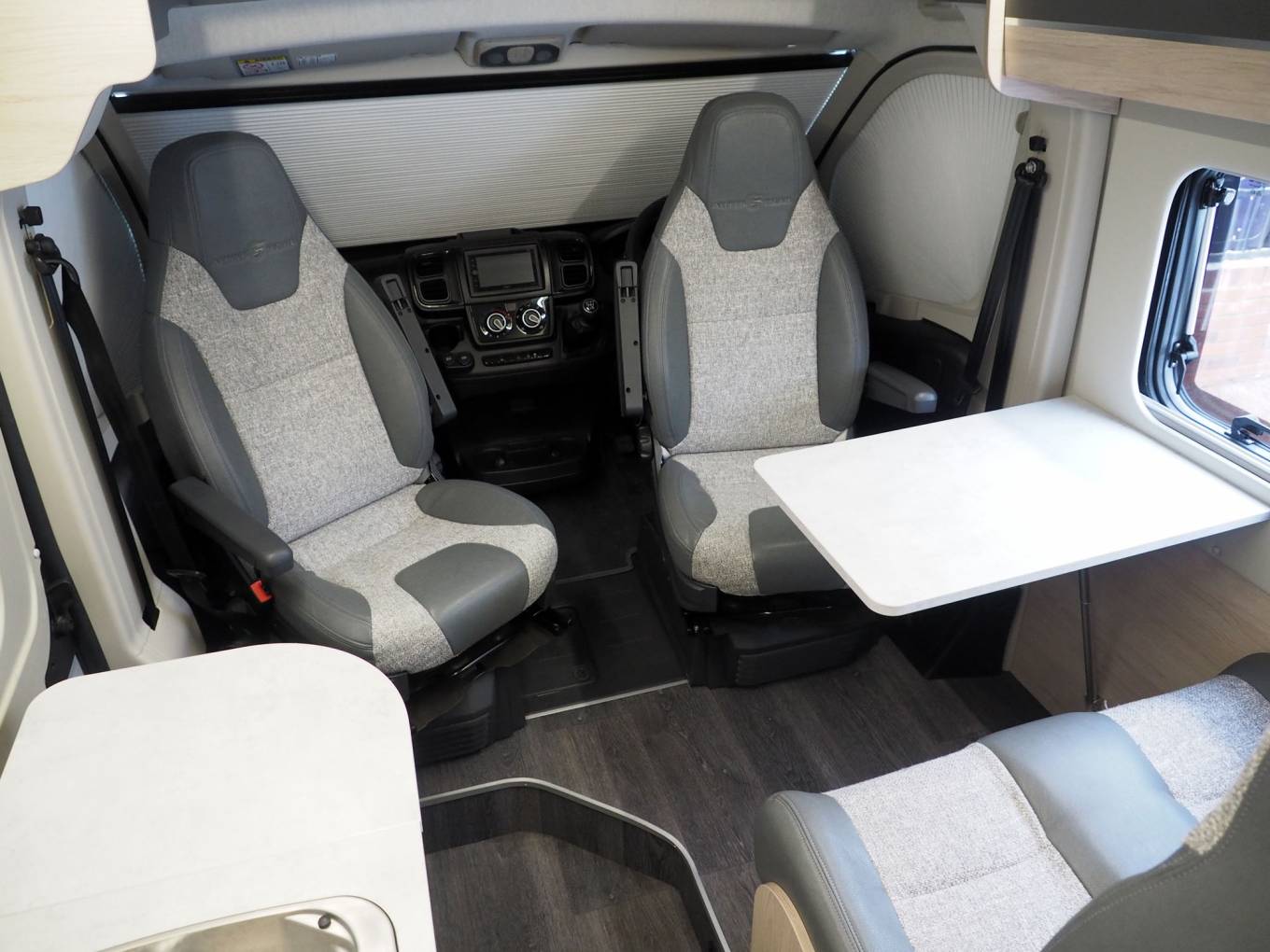 Up front the cab offers light controls, six speed gearbox married to the 140bhp, latest generation 2.2 litre Fiat Ducato, with cab air conditioning, cruise control, media unit, integrated night blinds all present.