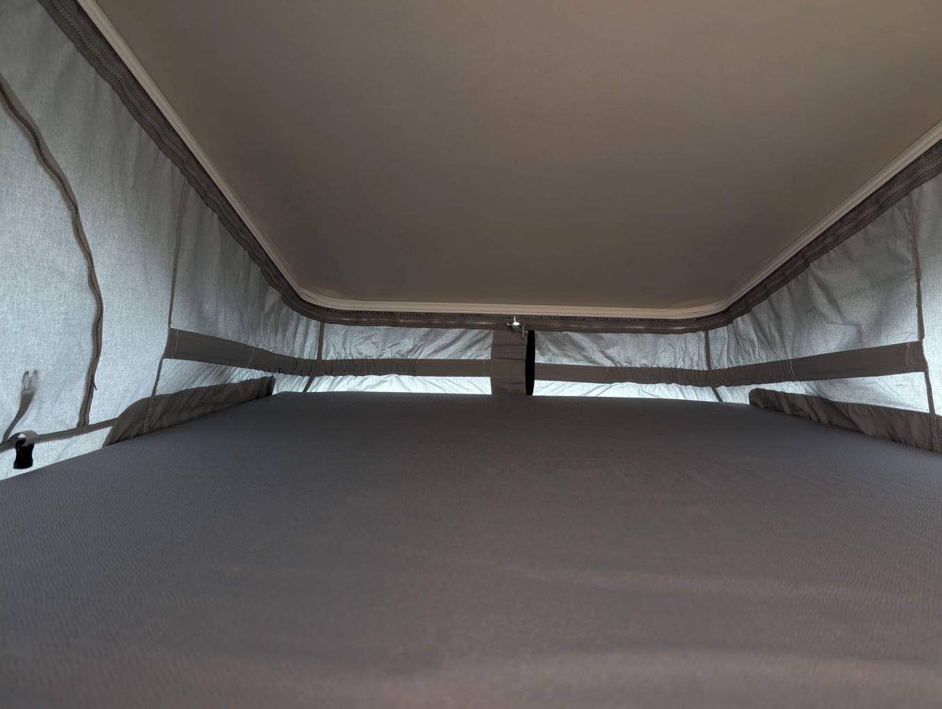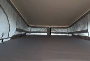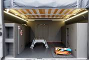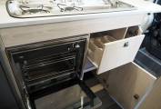 To the rear is a very good sized double bed with good headroom and lighting mounted over the rear garage, which has a variety of storage, lighting and internal access. Plenty of room here for bikes and outdoor equipment. A neat touch is the fabric screen to protect the bedroom area when the rear doors are open.