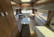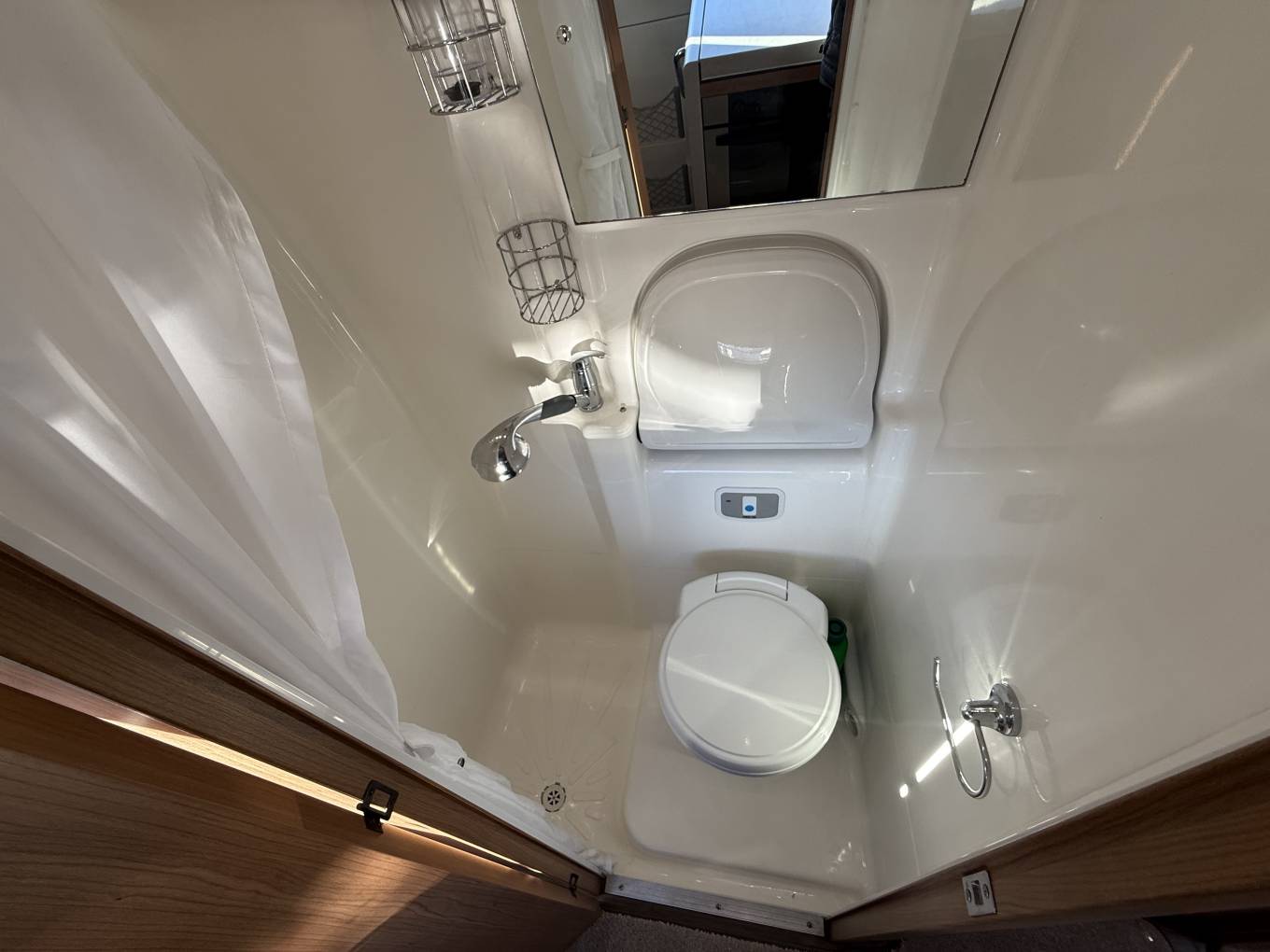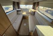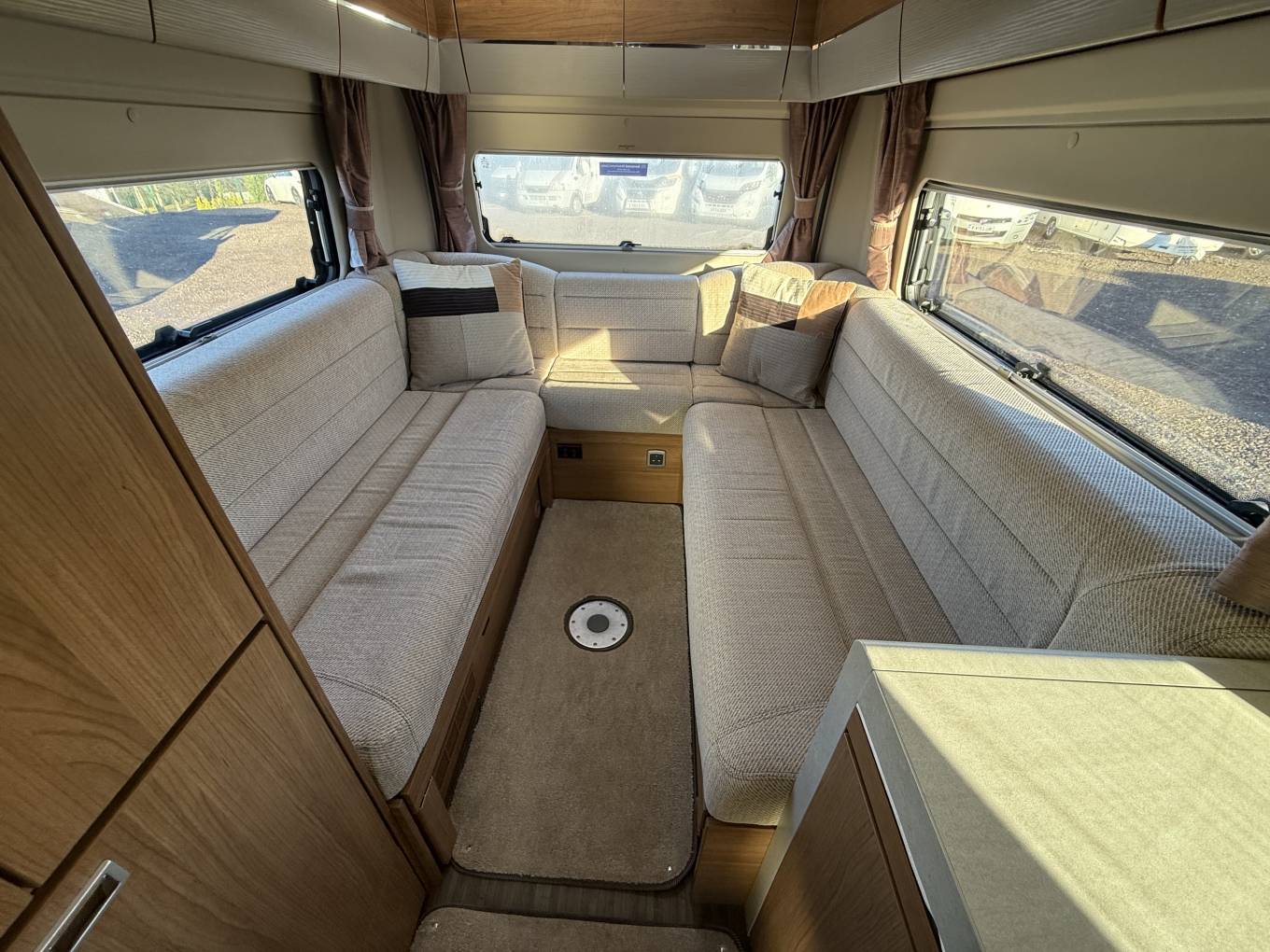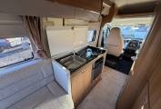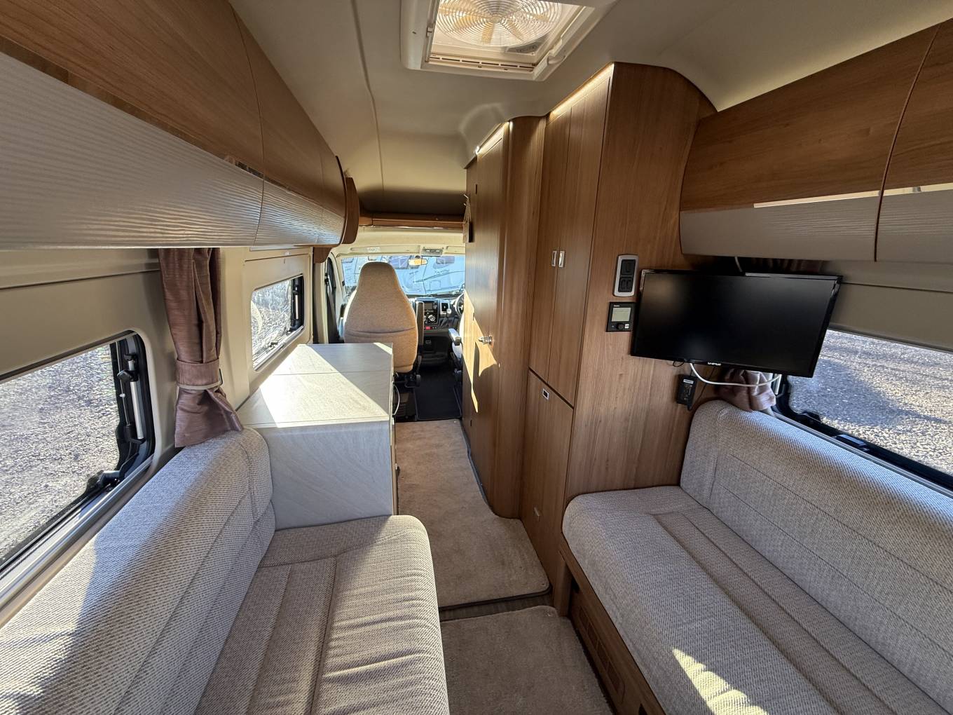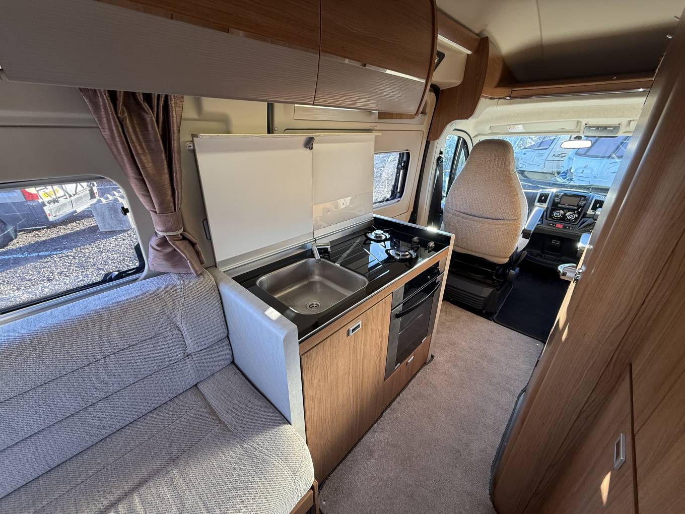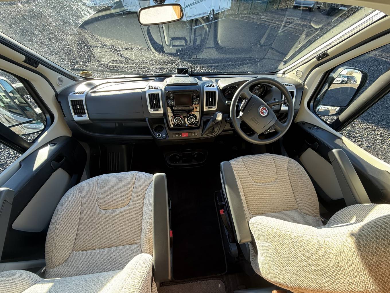 The layout from the rear has the sought-after U-shaped end lounge, which easily converts at night into a large double bed or can be used as two single beds this area has full round panoramic windows and has a fitted TV/DVD player with aerial. Further forward you have a fully functional wet room with cassette toilet and shower, adjacent you have the kitchen area which has a 2 gas burner hob, sink, oven and grill which is a rarer find in this class of motorhome, there’s also a compressor fridge freezer under the wardrobe and further forward to the cab area the 2 seats swivel when needed.