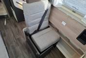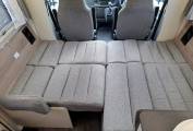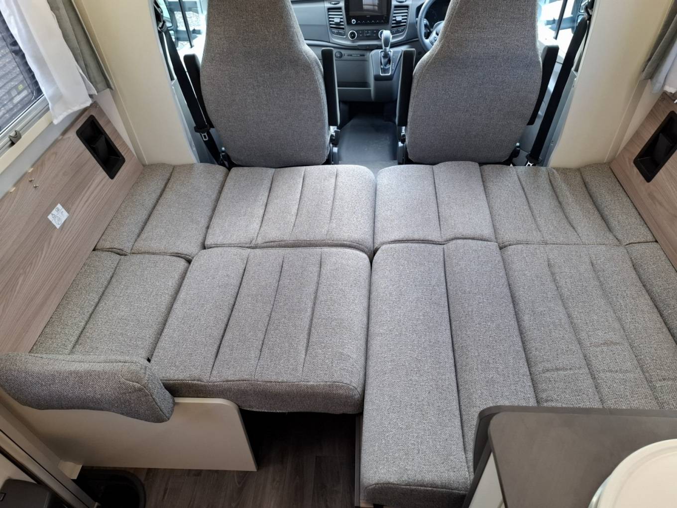 In the forward habitation there is a lounge with opposing side sofa seating that forms a comfortable area for relaxation and dining, and which can be augmented by use of the swivel cab seats. This seating can be readily converted into a transverse double berth. Beneath the sofas are fold up forward facing travel seats with belts.