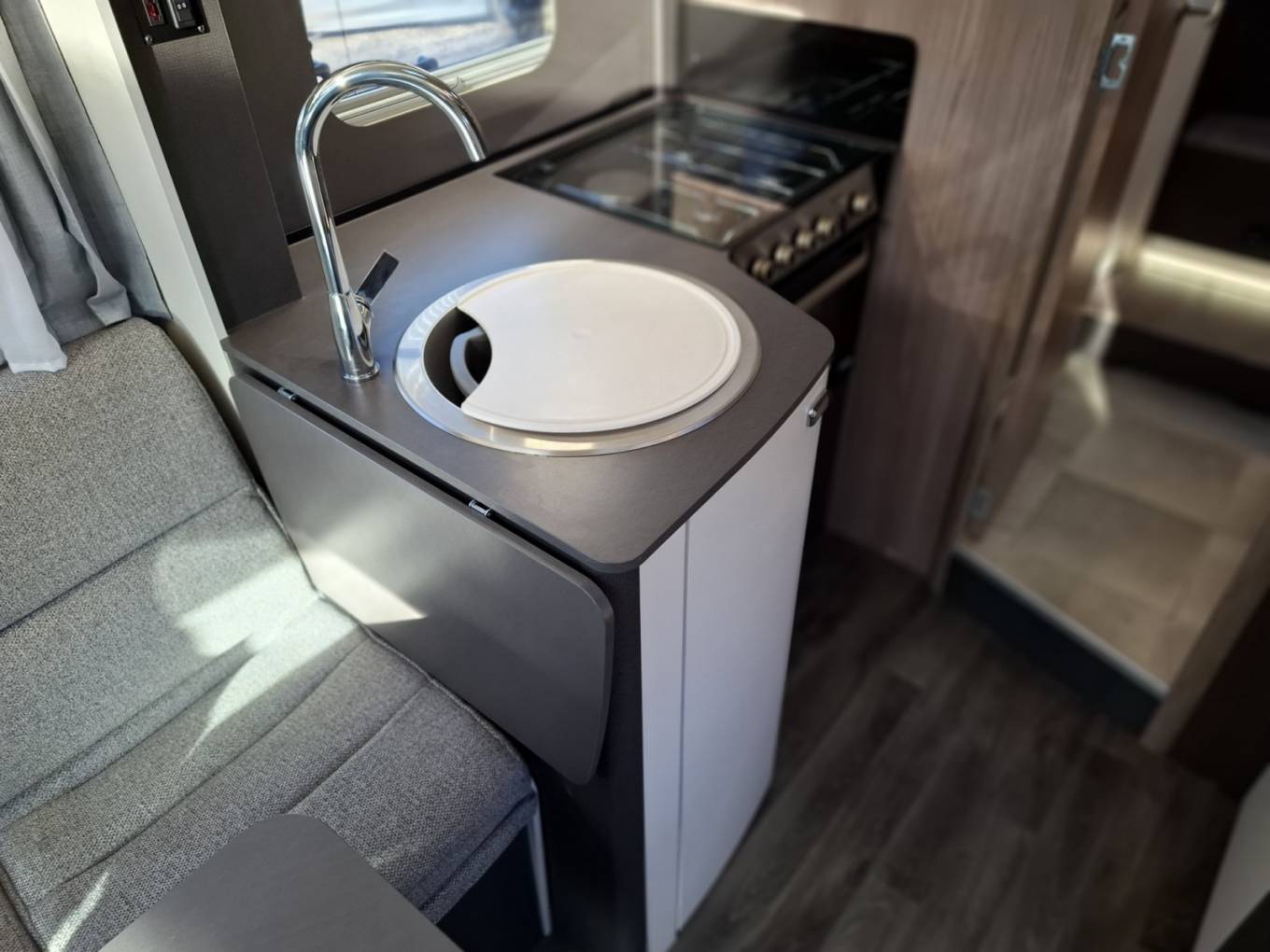 Behind the forward leisure /dining area there is an offside kitchen comprising a combination gas oven/grill, a hob (with 3 gas burners and an electric plate), and a sink.Opposite, by the nearside habitation door is a tall fridge with a freezer box.