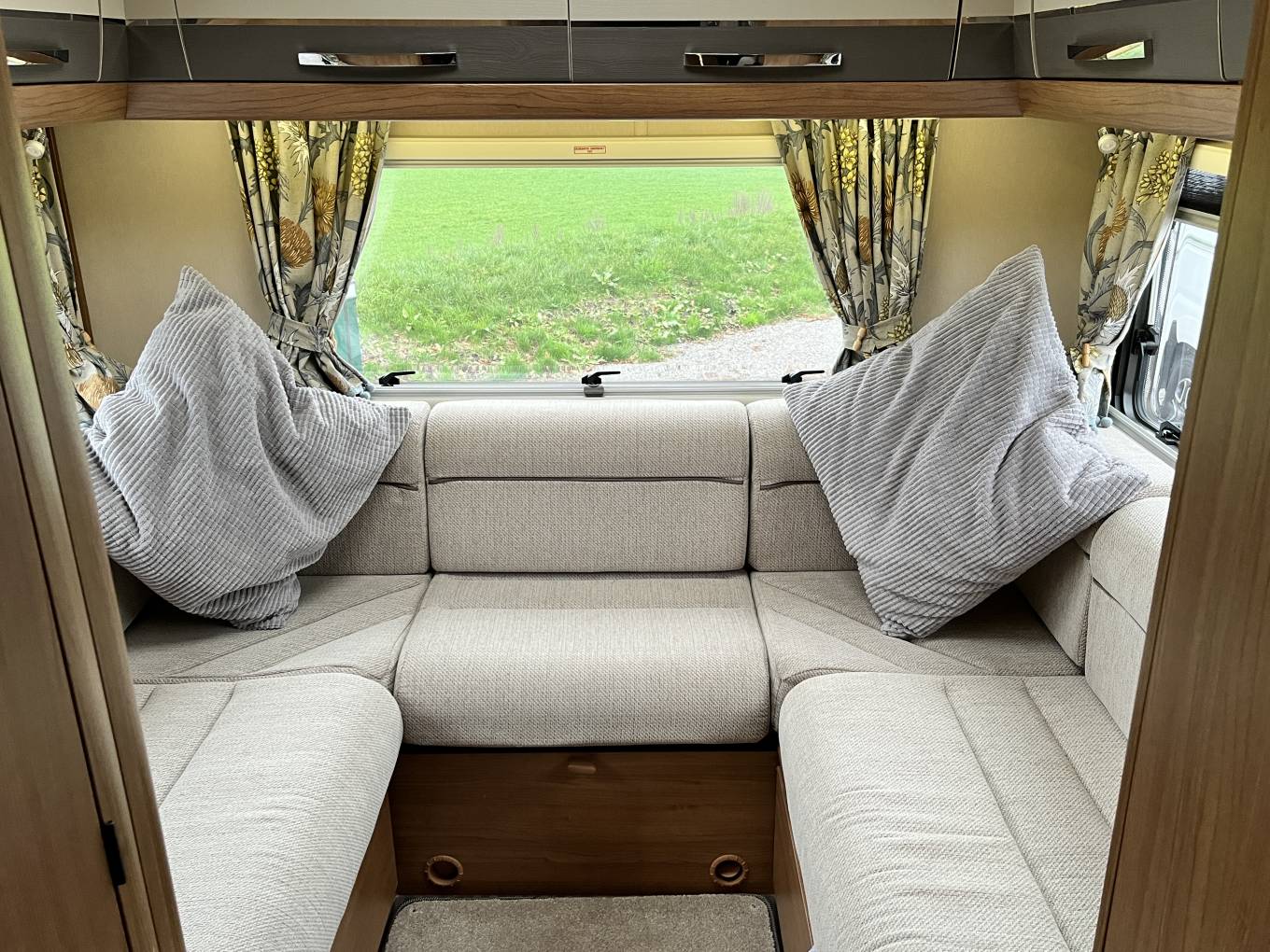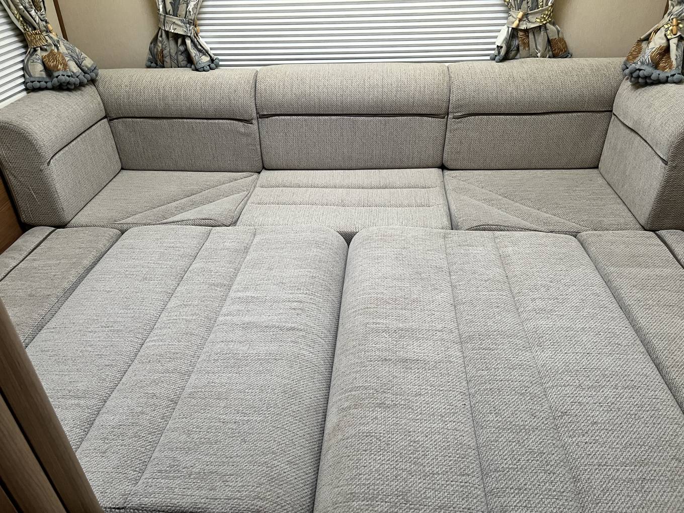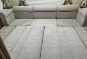 Sleeping – U-shaped lounge converts to large double bed, over cab double bed plus kitchen/dinette double bed, plug sockets, LED lighting and flyscreens/blinds and curtains.