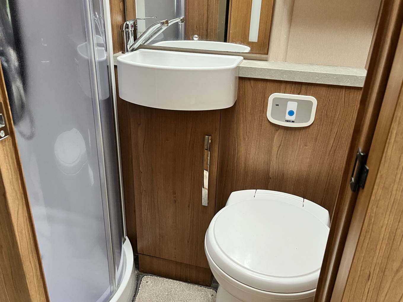 Washroom – Consists of a shower enclosure, electric flush cassette toilet and sink with a small unit underneath and a wall mounted mirror.