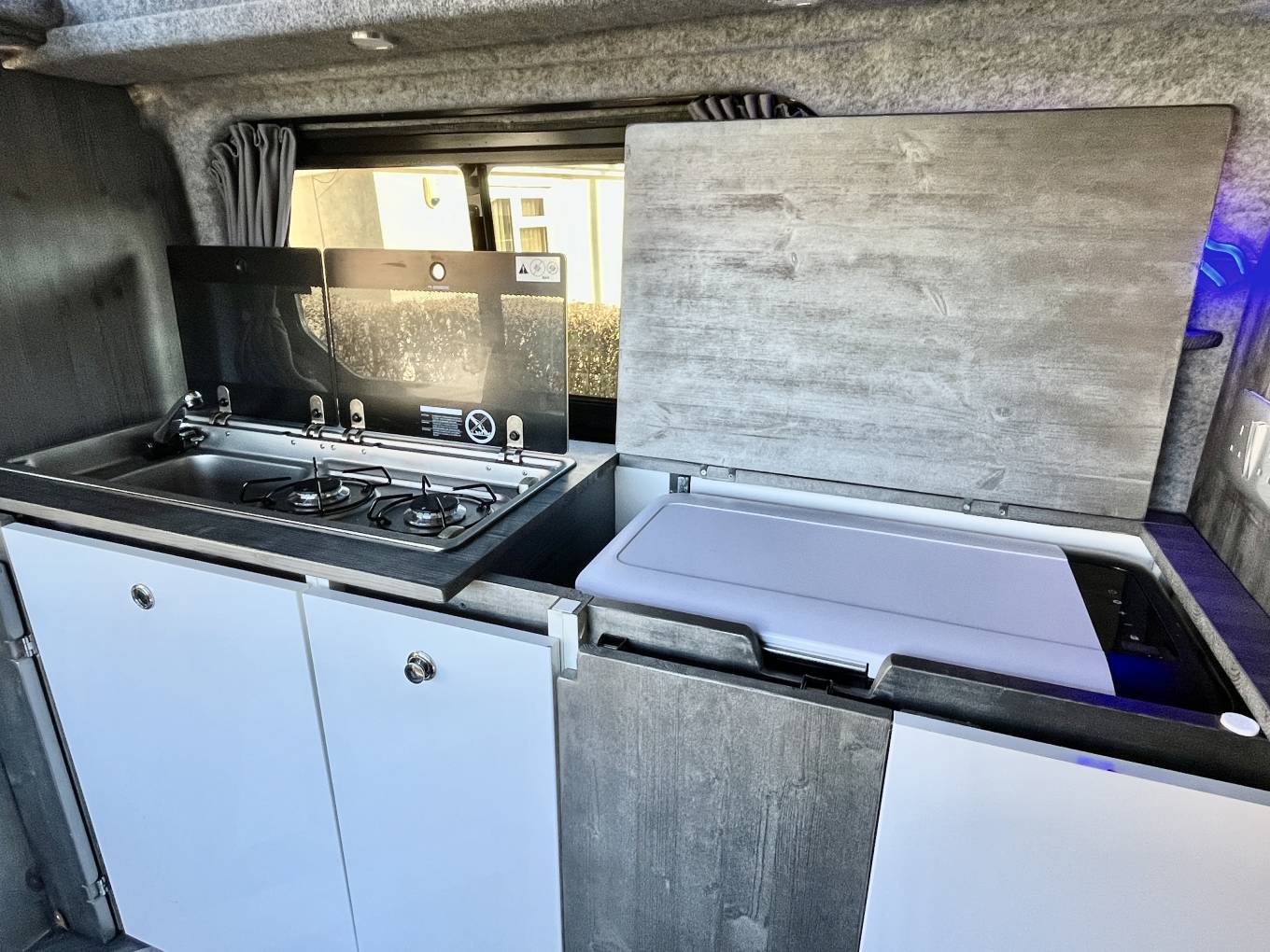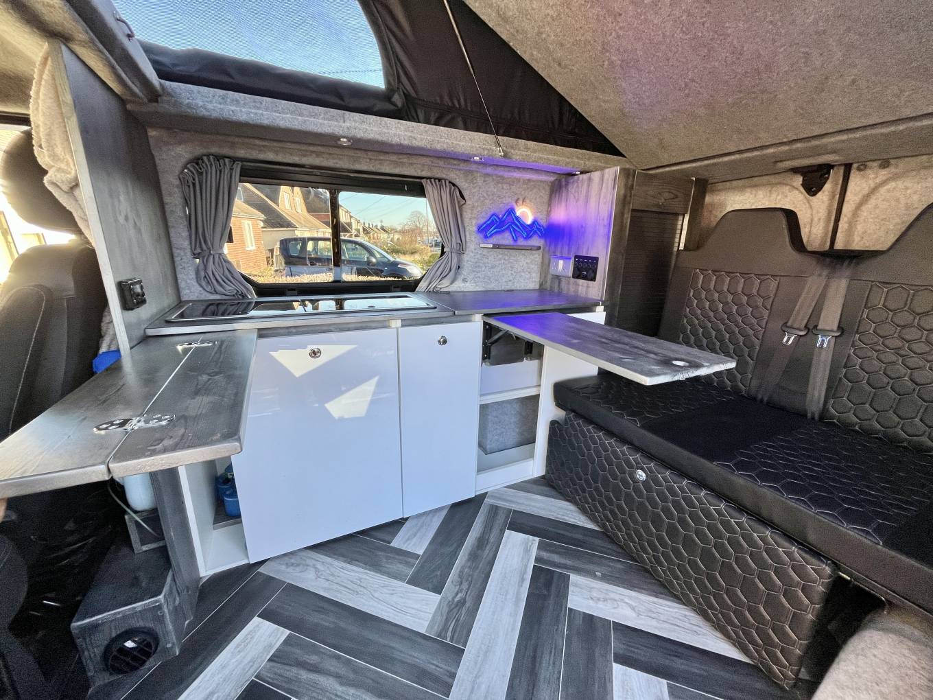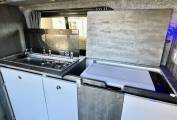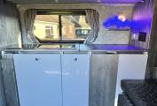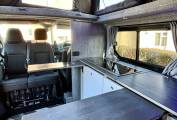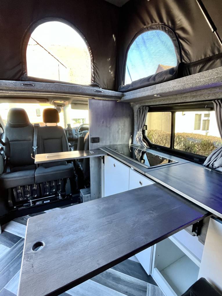 Once inside the van the first thing you notice is the feeling of space, it is well laid out and has the advantage of kitchen area with two burner hob, sink with tap, concealed fridge under the worktop and a good deal of worktop space, there are also two very smartly designed fold away tables in the kitchen area. The rock and roll bed seating easily converts to a double bed and with the pop top extended you have a second large double sleeping area above, the pop top has three zip down windows and the pop top sides can be fully unzipped to create a "scenic" open space.