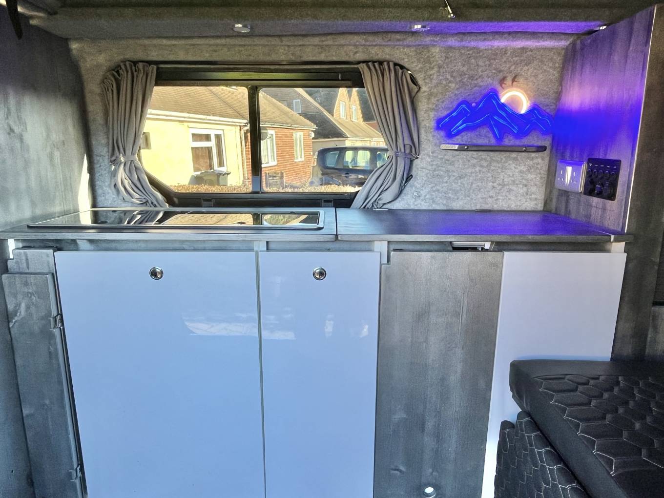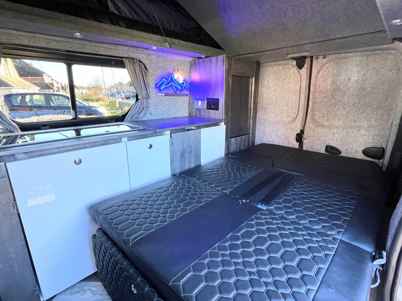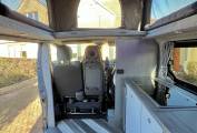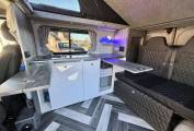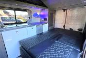 The twin front passenger seats swivel in to the habitation area creating a great dining and socialising space for up to five people, heating is provided by a diesel heater and 12V power is supplied by a an AGM 110AH leisure battery, supported by a 130W solar panel, there is stylish LED lighting, charging points, 12V and plug points available. Electric hook up point is within rear of the van and there is plenty of storage options available. Night time comfort is provided with the on board porta-potti.