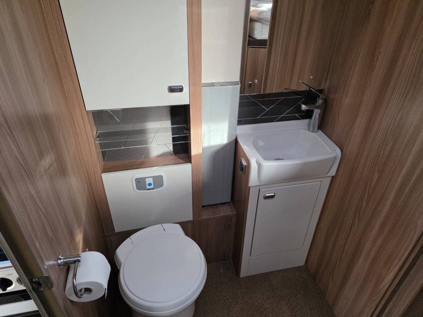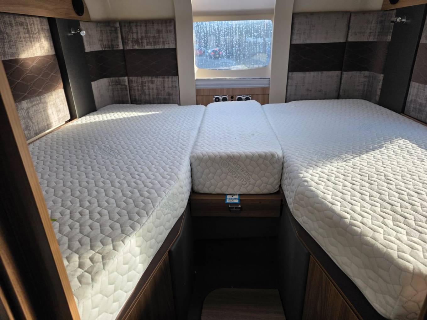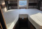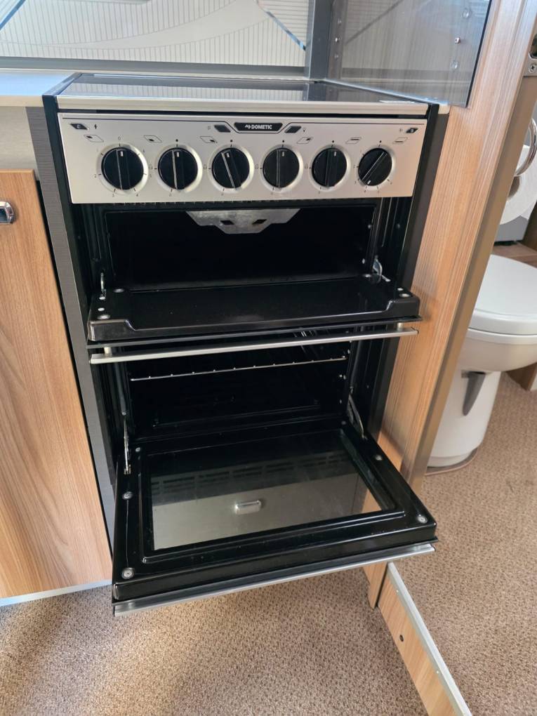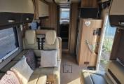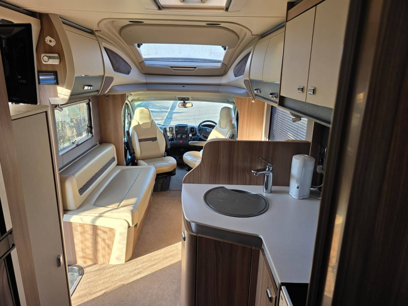At the rear is the fixed bed which can be used as 2 singles or a double, forward from this is the bathroom with separate shower compartment. In the centre there is a well equipped kitchen, including microwave and at the front is the lounge area with 2 captains seats