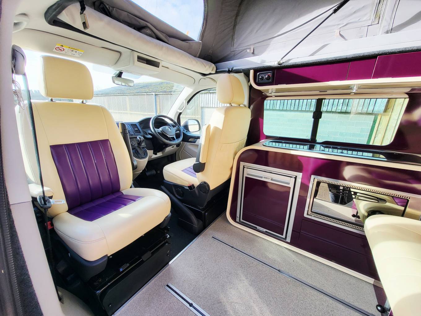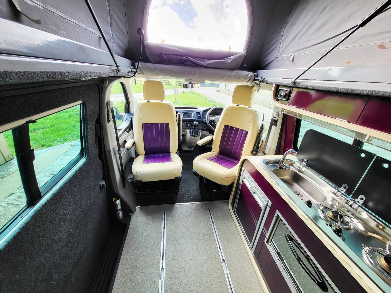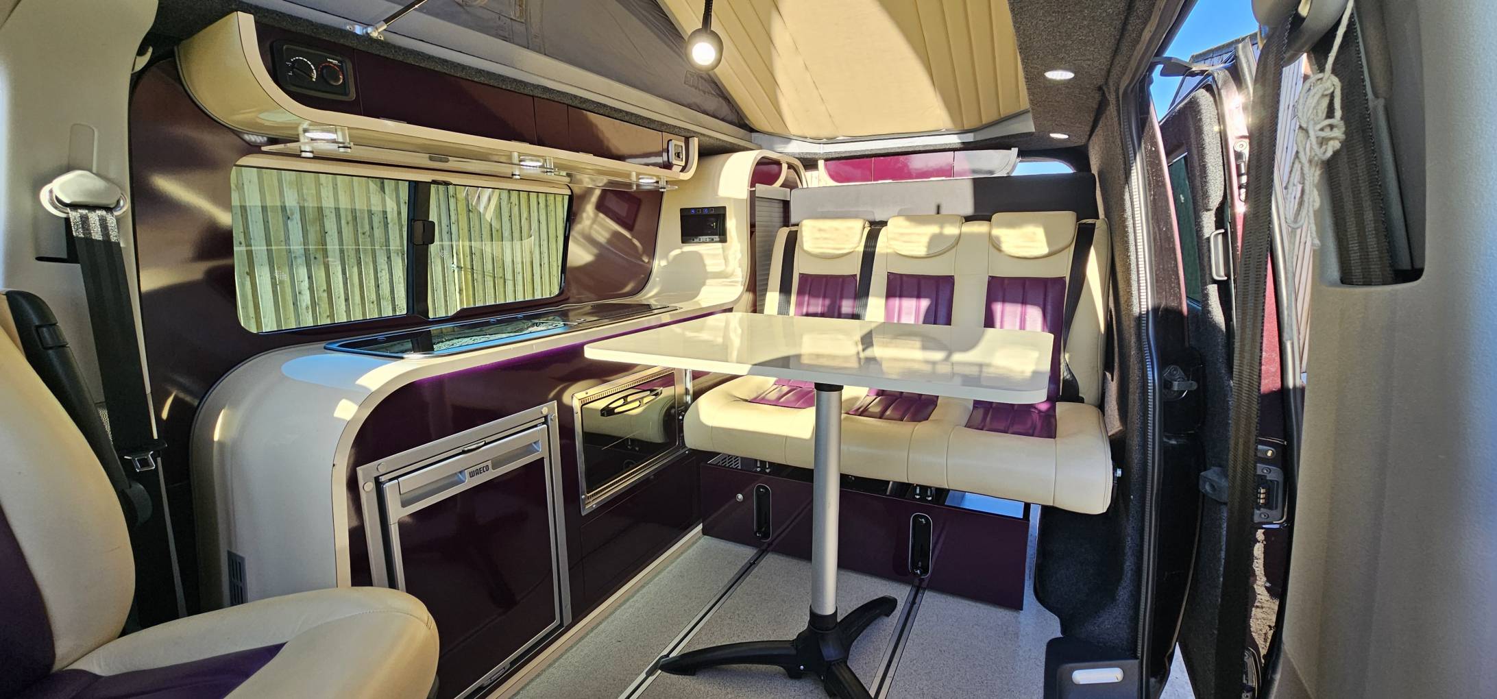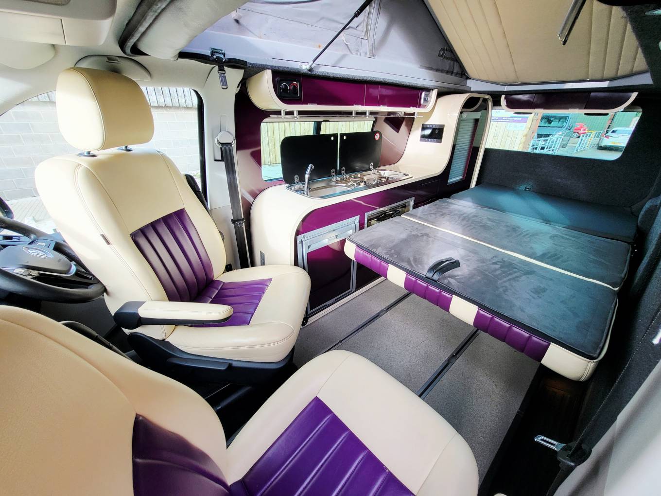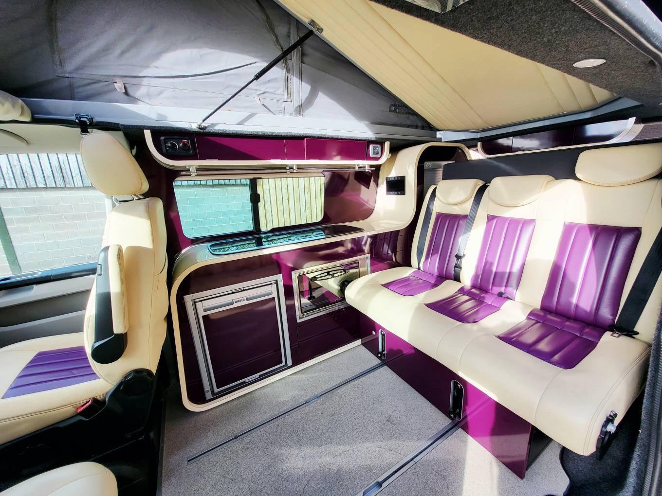 Converted by Three Bridges Campers near Oxford, they were eye-wateringly expensive but superb quality with the “Infinity 2 “ interior being made individually by their in-house joiner in blackberry and cream to match the colour of the vehicle.