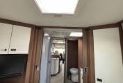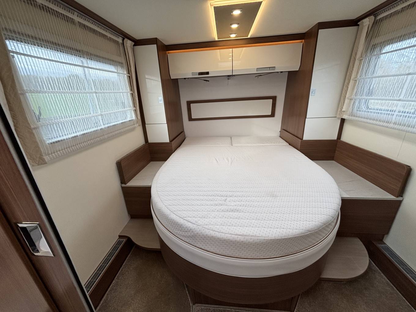 Relax in the rear island bed, complemented by elegant wardrobes and reading lights. A large electronic drop-down bed above the cab provides additional sleeping space without compromising style.