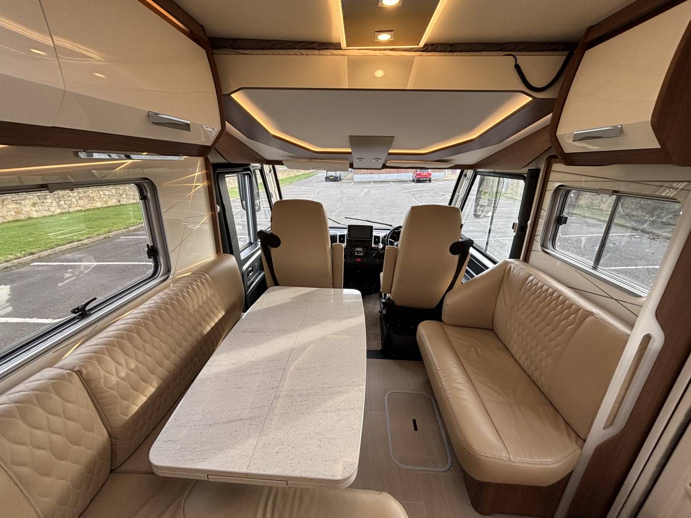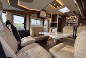 Step inside and indulge in a spacious lounge adorned with premium cream leather seating for up to seven guests. The extendable, adjustable dining table and soft-close storage solutions create an environment of refined practicality. Ambient LED lighting, touch-sensitive controls, and integrated USB points enhance the modern aesthetic.