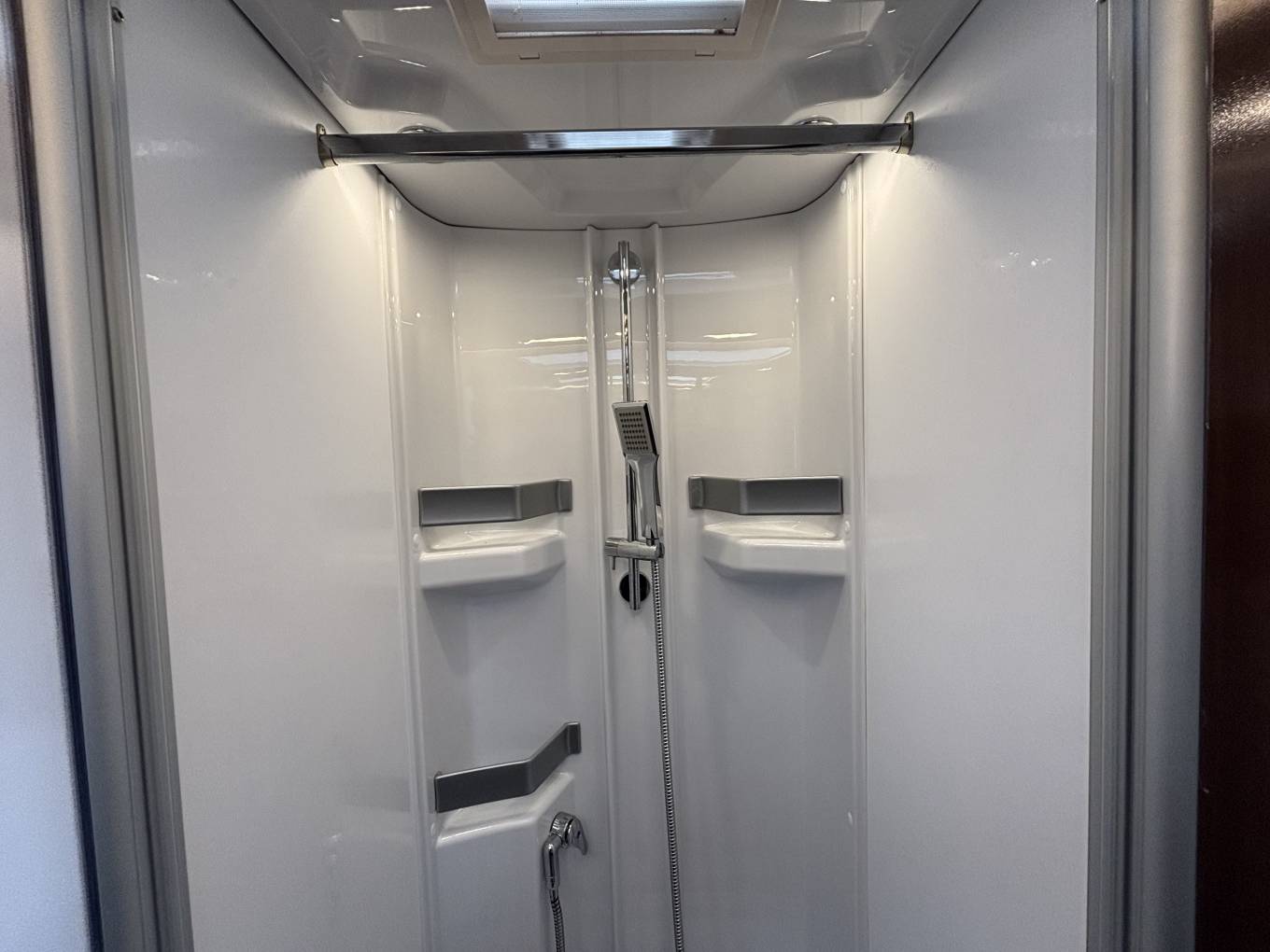 Enjoy a private washroom with a separate shower cubicle, Thetford toilet, and ample wardrobe space.
