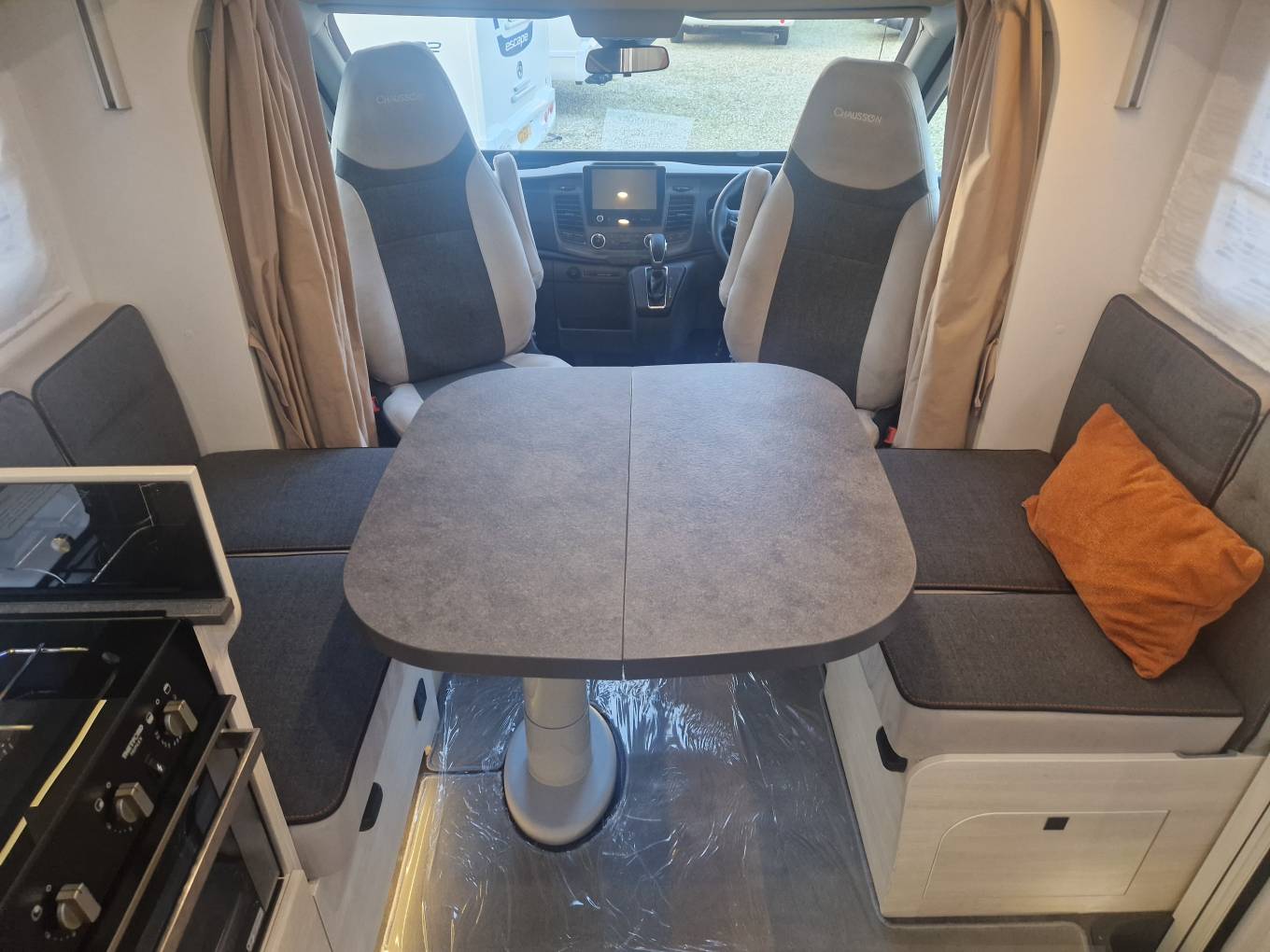 2023 Chausson 777GA Titanium Ultimate 4 berth 4 travel seats low profile automatic motorhome for sale. This Chausson model is ideal for couples or small families seeking a stylish, spacious motorhome with generous storage and year-round touring capability. Presented in beautiful condition with under 4000 miles. The 777GA Titanium Ultimate combines smart design, spacious living, and high-end features—all under 7.2m. Fixed twin single beds plus drop-down bed, smart lounge with face-to-face seating and 2 additional travel seats, 3-ring hob, oven/grill, large fridge/freezer, full-width rear washroom with separate shower, large rear garage with twin access doors and diesel heating system for year-round comfort. Other features include solar panel, reverse camera, awning, o/s gas point, o/s shower point, Avtex Smart TV and Wifi. Finance and part exchange available. Please call for further details.