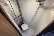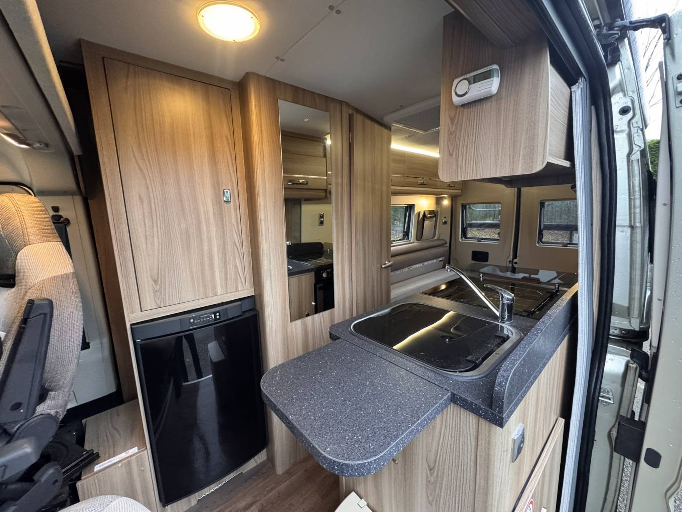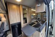 The rear of the motorhome is fitted out with twin settees and a unique extra seat creating a U shaped lounge with extra storage makes a good sized double bed or twin singles. The rear seating area benefits from a tv and choice of two tables. In the middle of the motorhome is a very nice, well equipped kitchenette, fitted out with a 3 burner gas hob, oven/grill, sink and a fridge with ice box. There are plenty of storage cupboards and compartments throughout the living and kitchen areas giving you excellent storage in a compact motorhome. Across from the kitchen is a lovely bathroom equipped with sink, toilet and a shower.