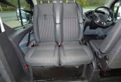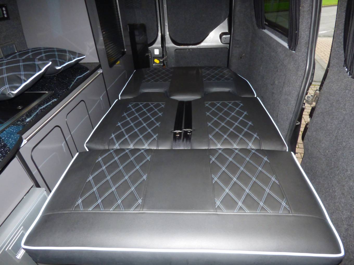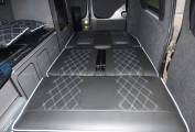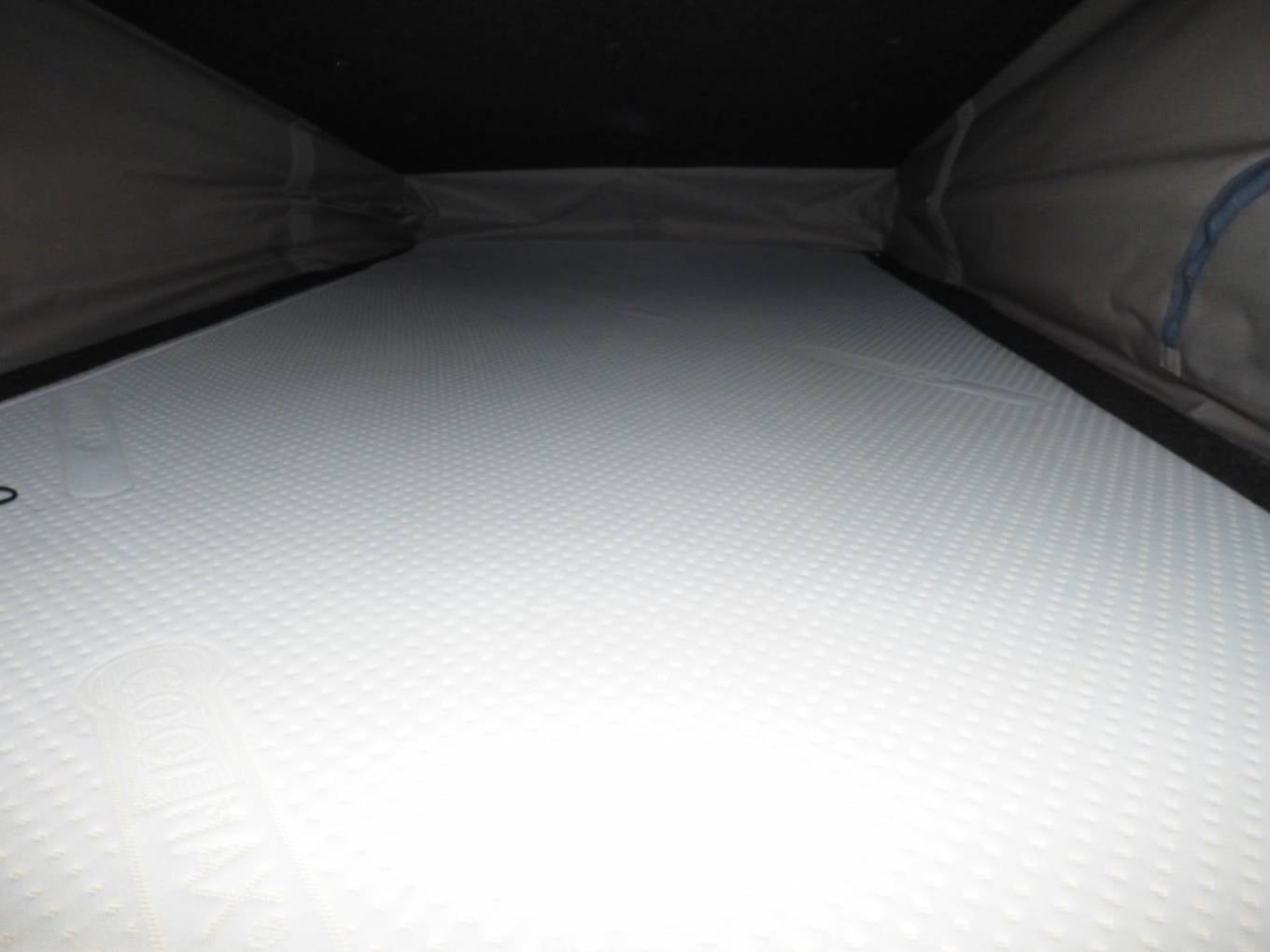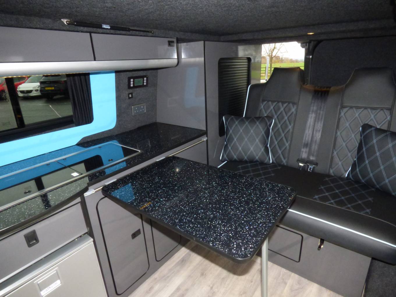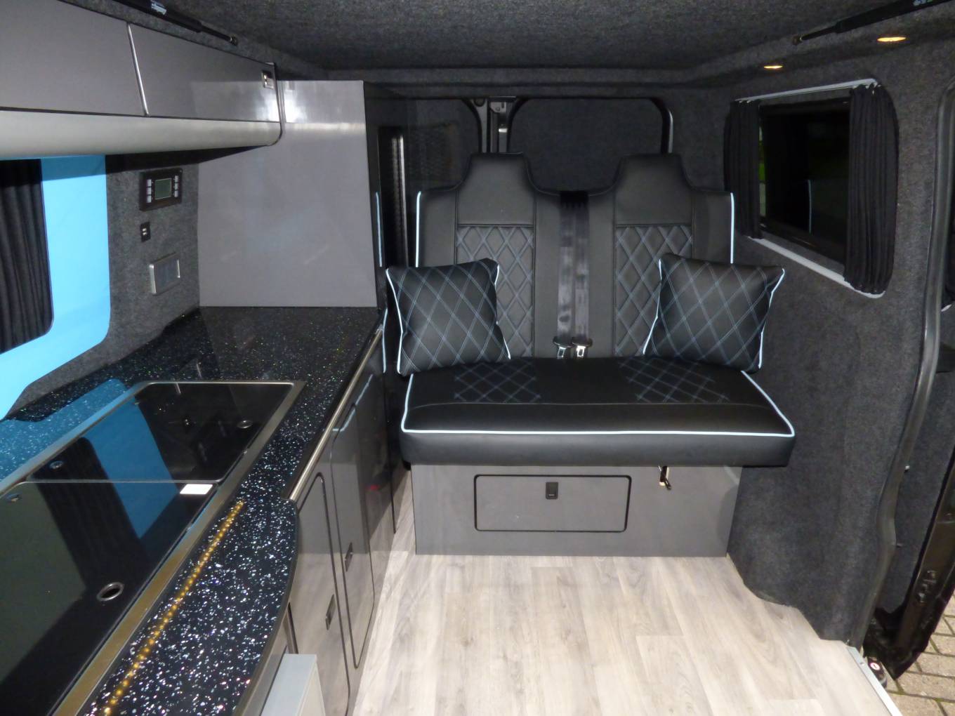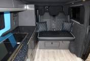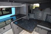 Traditional in layout with pop top roof incorporating panoramic zipped windows and double bed space. The main body of the camper has a rock and roll bed in faux leather, 2 ring gas hob, sink with tap, Isotherm fridge, gas bottle and leisure battery. The table for the dining/socialising area is stowed in one of the rear barn doors. There are plenty of lockers and cupboards around the van with onboard fresh and waste water containers and individual soft touch lighting. The front passenger seats turn to face the cabin area and a leisure battery is located in the rear offside locker.