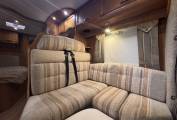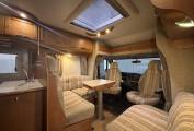 At the front of the motorhome there is a comfortable lounge/dining area. Bench sofas and the swivel captains chairs make this the perfect place to sit and relax and the large sunroof let's natural light flood in. The folding central table also creates a great dining area, comfortably sitting 6. This area can also be converted to a small double or good sized single.