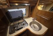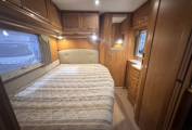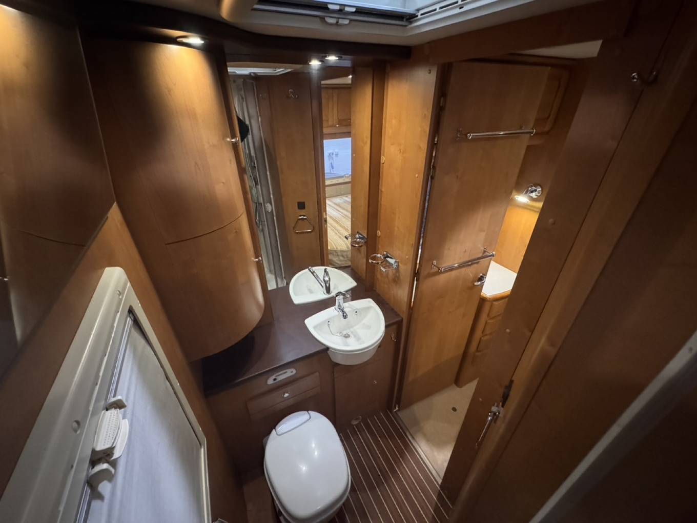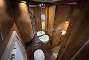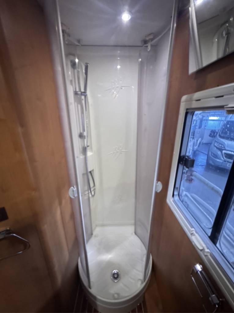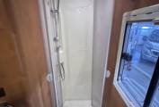 At the back of the motorhome there is the very generous French bed. This is ideal for those not wanting the constant hassle of putting up, making and putting away a bed. There is also plenty of storage space. The French bed lifts up where you will find a large storage area, which can also be accessed from an external door. At the back is a lovely washroom featuring cassette toilette, wash basin and shower. The bathroom has window ventilation.