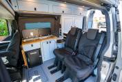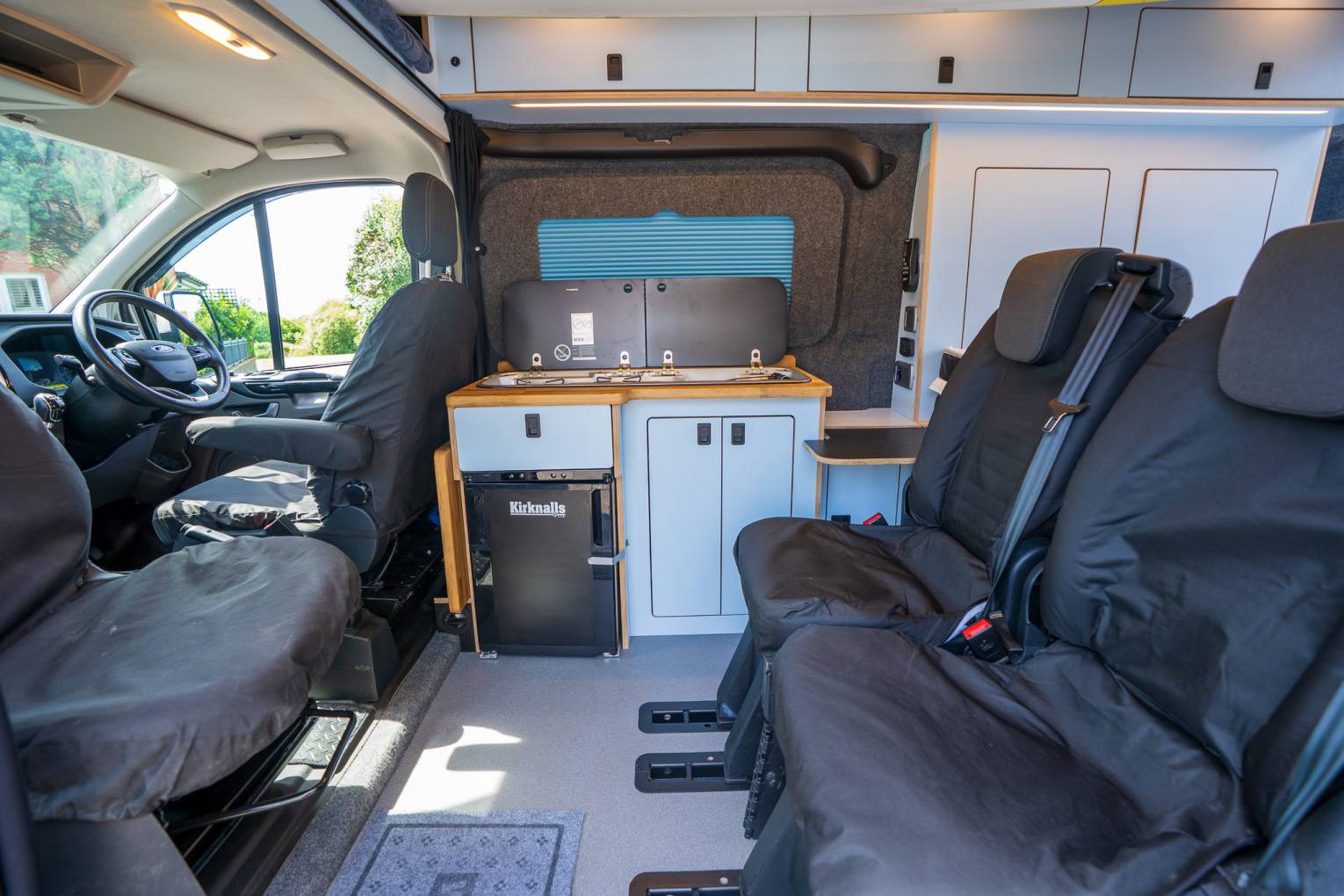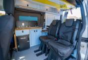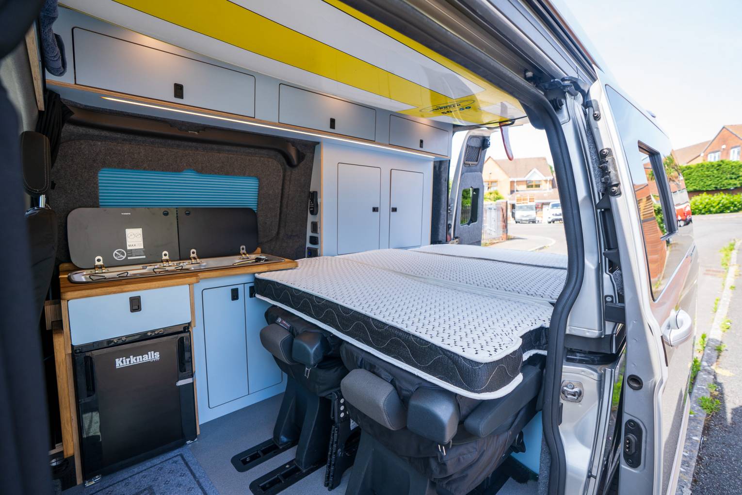 The Double Bed is the standout feature of this vehicle, and demonstrates how you can live in luxury whilst on the road. The Foldaway expansion section sits ontop of the two rear seats, which means you'll have enough space for two adults to sleep comfortably, whilst the fixed underbed storage means you'll be able to travel with enough supplies to keep you going for long periods off-grid. The van comes with a diesel heater which is connected to the main tank, a 120ah Lithium Battery, MaxxAir Fan, Apple Play ready Centre Console, Removable dining table and a single swivel seat in the front.