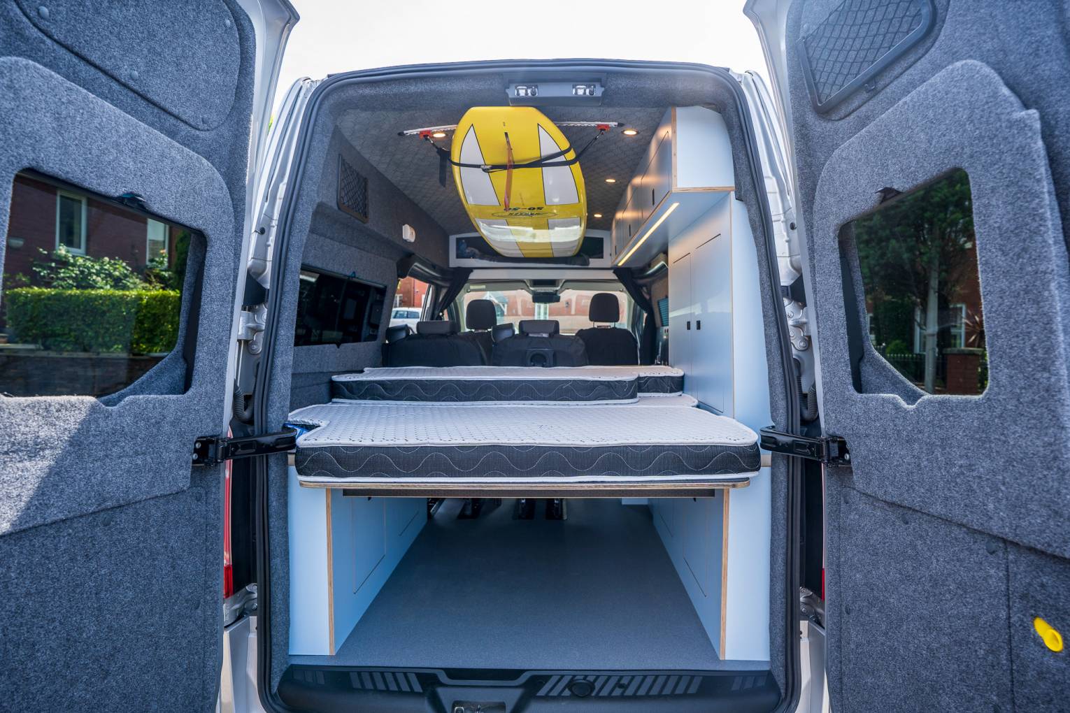 This vehicle comes complete with FH's bespoke Van Ply Lining, Insulation/ Soundproofing and ceiling LED Lights. It comes with a large foldaway double bed, 4 Belted Seats (w/ Seat Covers) and a useful overcab storage section and Ceiling mounts so you can store your Surf Board, Paddle boards or anything else you need on your next Off-Grid Beach Adventures. (SurfBoard Pictured Not Included)