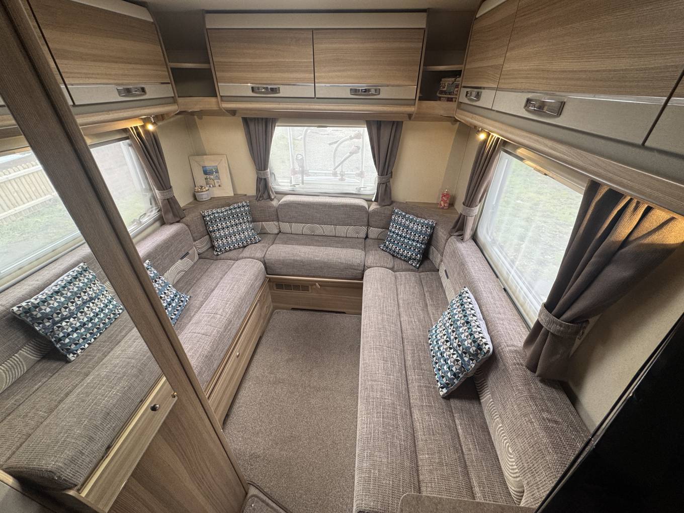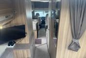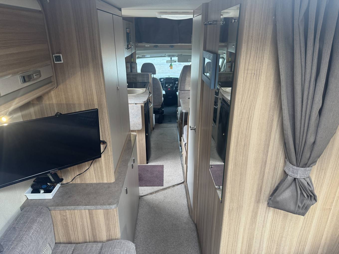 As you enter the motorhome you have the highly desired rear lounge layout featuring a U shaped sofas, TV, Ariel and plenty of overhead storage. The rear lounge is flooded with lots of natural light thanks to the large rear and side windows and roof light.
