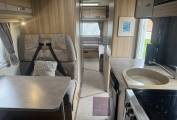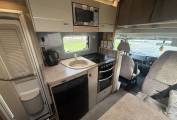 Carrying on through, you come to the kitchen which has everything you need to rustle up a lovely meal. There is a 3 gas ring/1 electric burner hob, a Thetford oven with grill, a large Dometic 3 way fridge freezer, a sink with mixer tap, a microwave and lots of storage space for utensils and ingredients plus a good work top area.