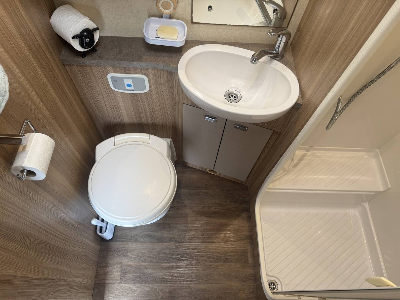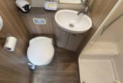 As we move through the motorhome, you have the popular large washroom which consists of a full length separate shower, Thetford Toilet, washbasin and storage cupboards and shelves with a good sized mirror.