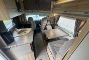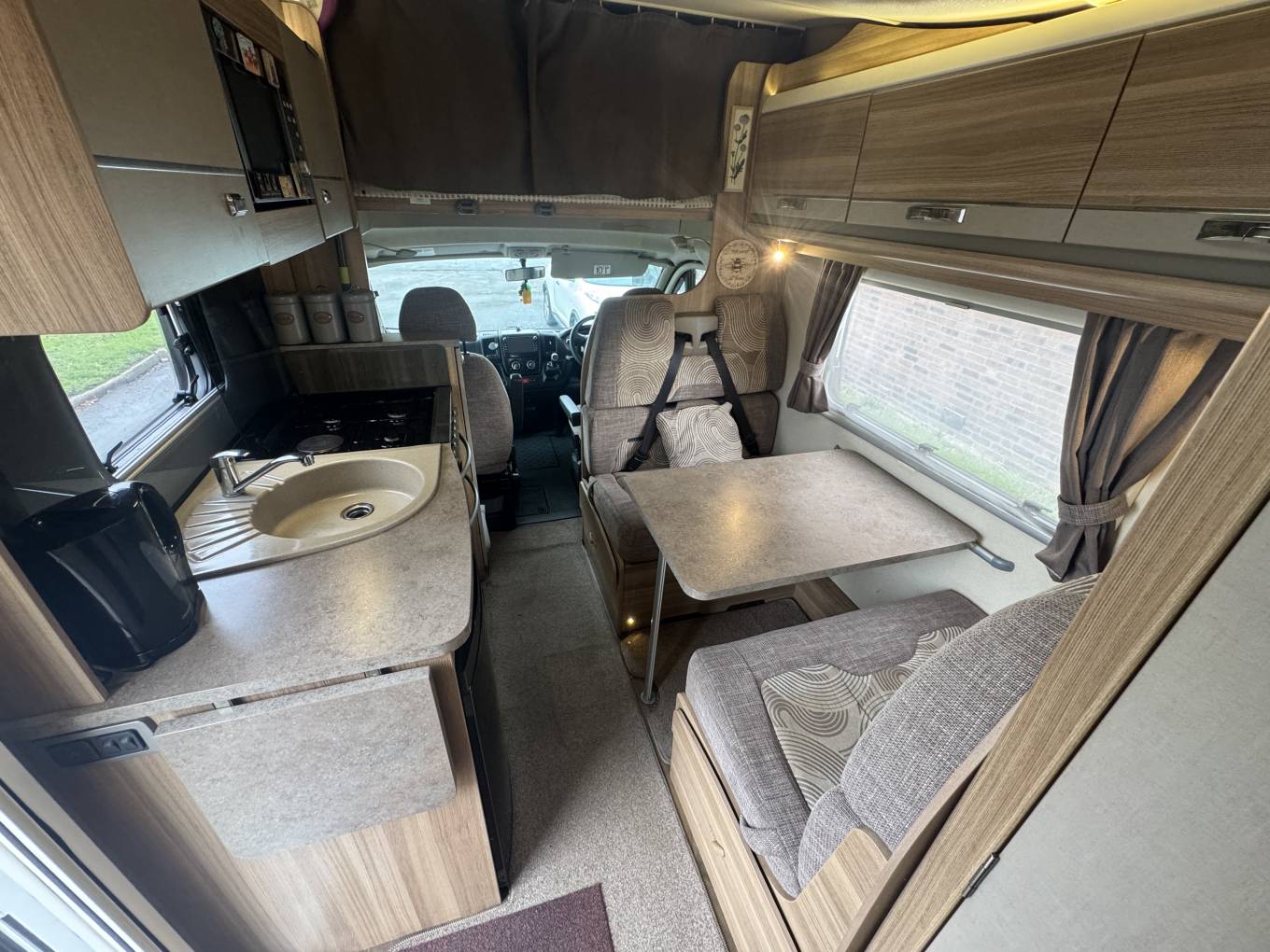 Opposite the kitchen is incredibly spacious central dinette which is a fabulous spot to relax and unwind in. There is a forward facing 2 seater sofa with 2 seat belts and a rear facing 2 seater sofa fitted with a further 2 seatbelts along with a large dining table in between. Above the cab is the third large double bed which is easily big enough for 2 tall adults..