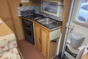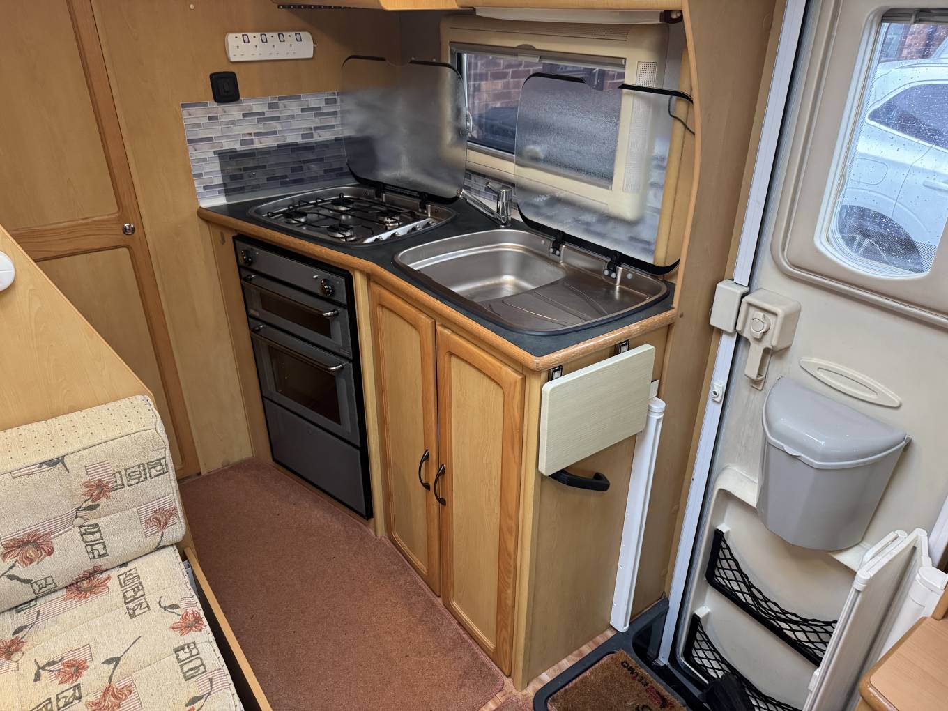 Moving through the motorhome we have the kitchen where there is a Thetford Oven with a grille and 4 ring gas hob, sink with mixer tap, and opposite is a large Dometic fridge with freezer compartment.