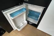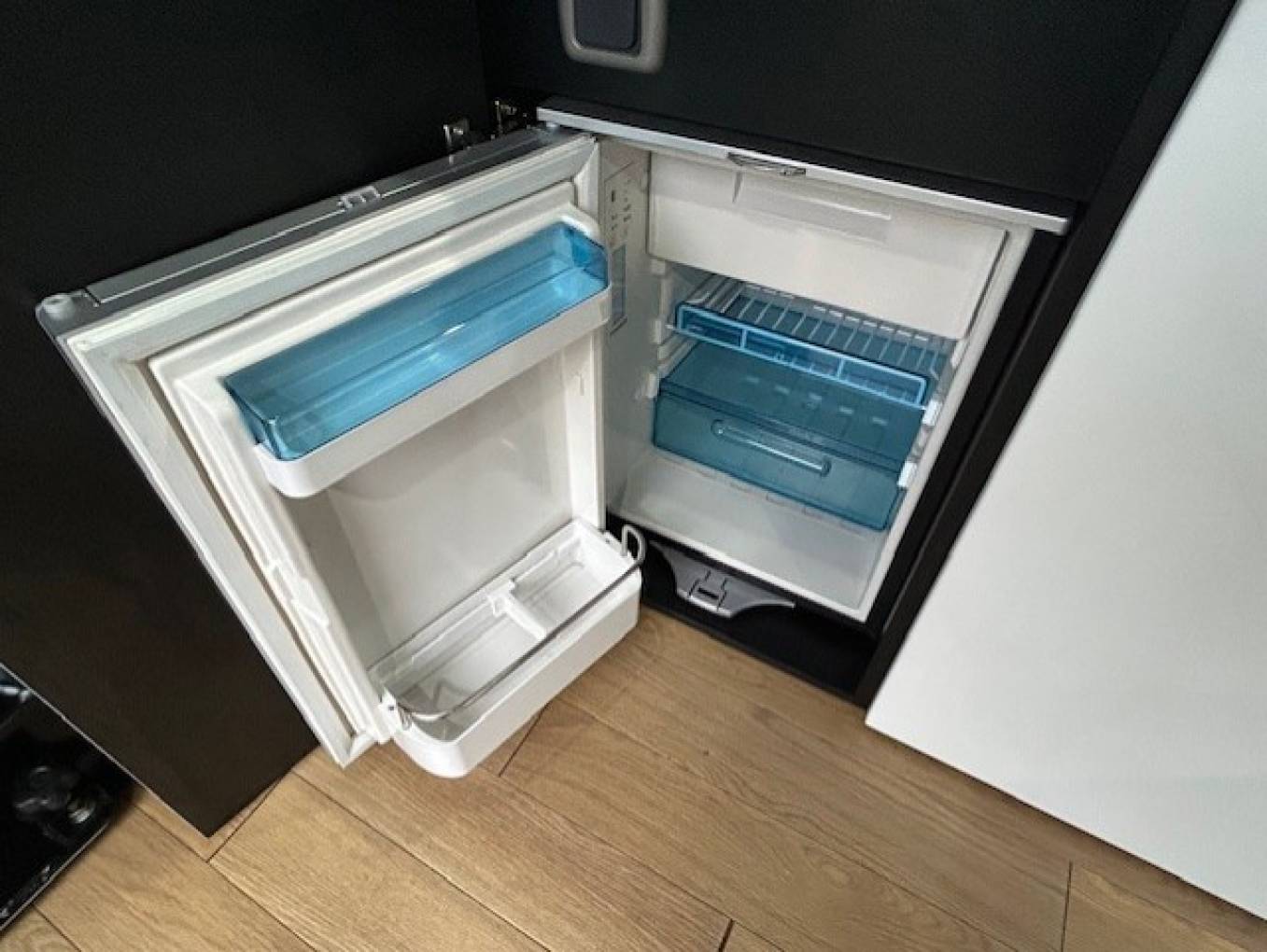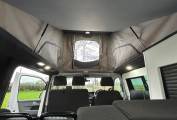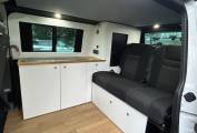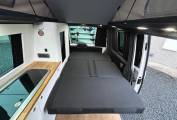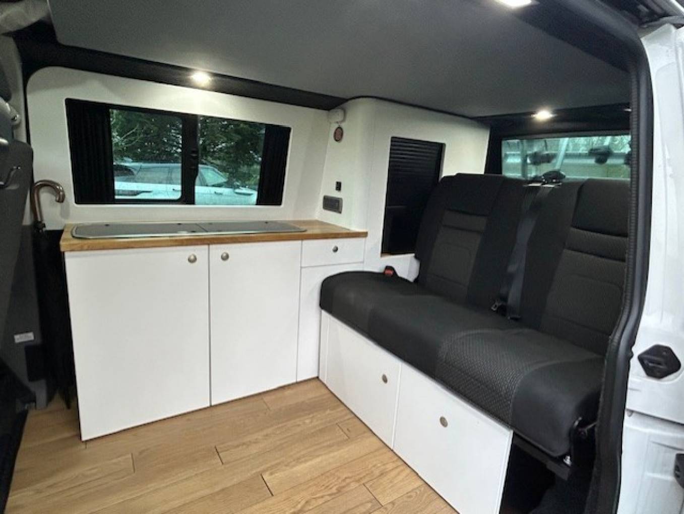 The compact kitchen includes a 2 gas burner hob, sink with onboard water supply and a small built in fridge. The swivelling front seat creates a lounge/dining area with a stowaway table. Good storage and LED lighting throughout the campervan.