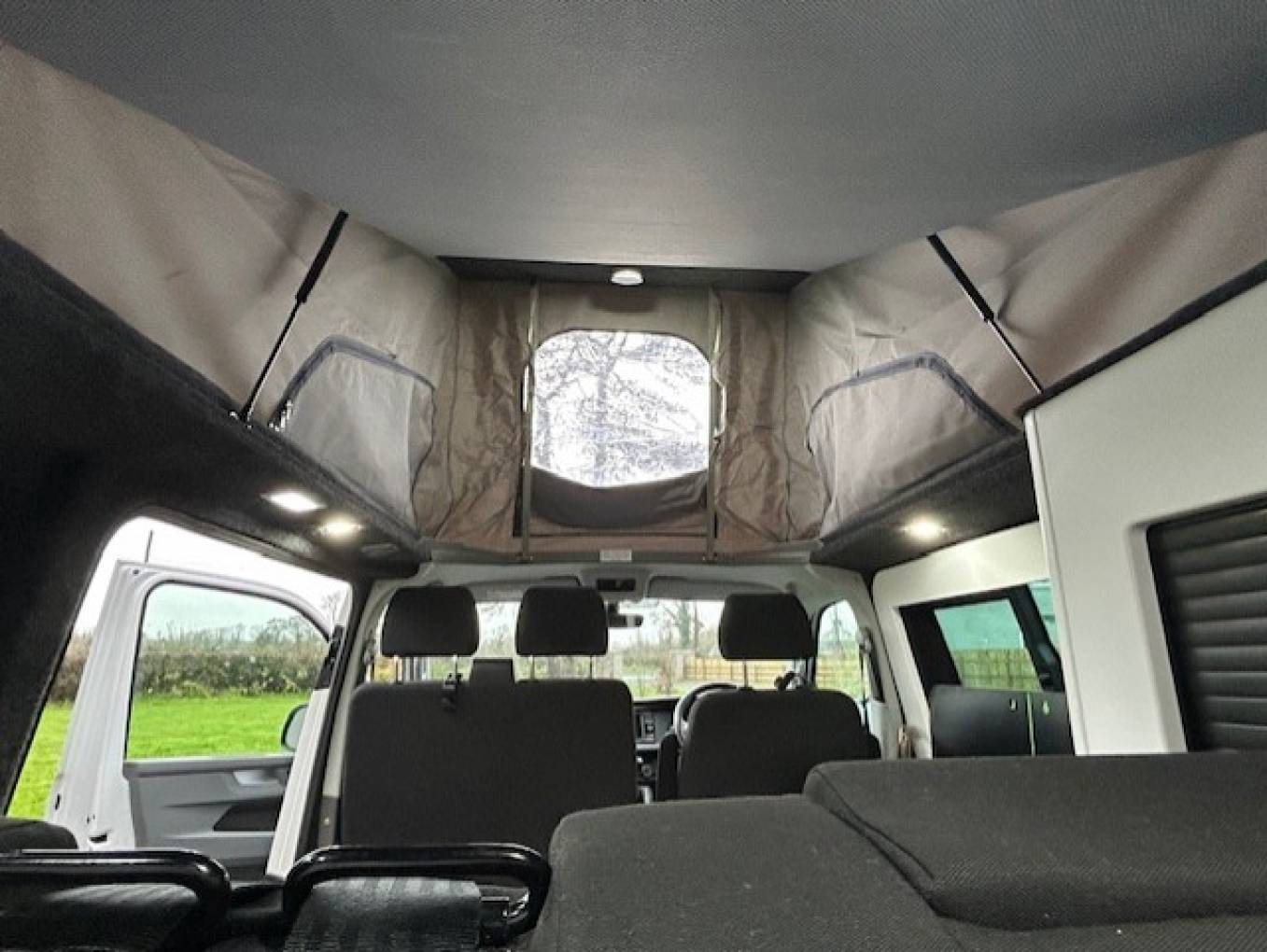 Inside, the layout is cleverly designed to maximise space. The seating area converts into a Rock n Roll bed to allow sleeping places for 2 people. The pop-top roof expands to give extra headroom and an extra sleeping berth.