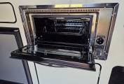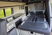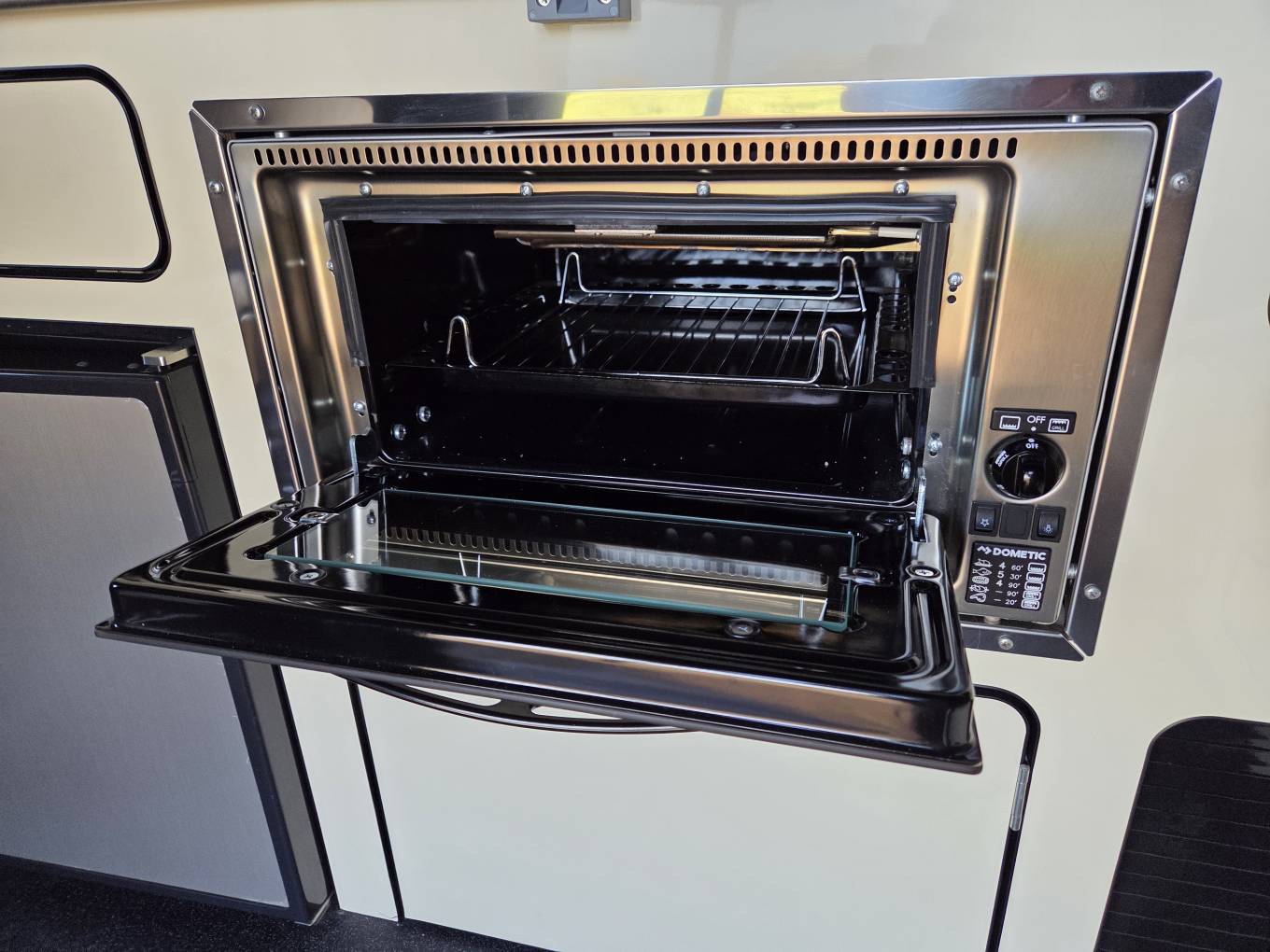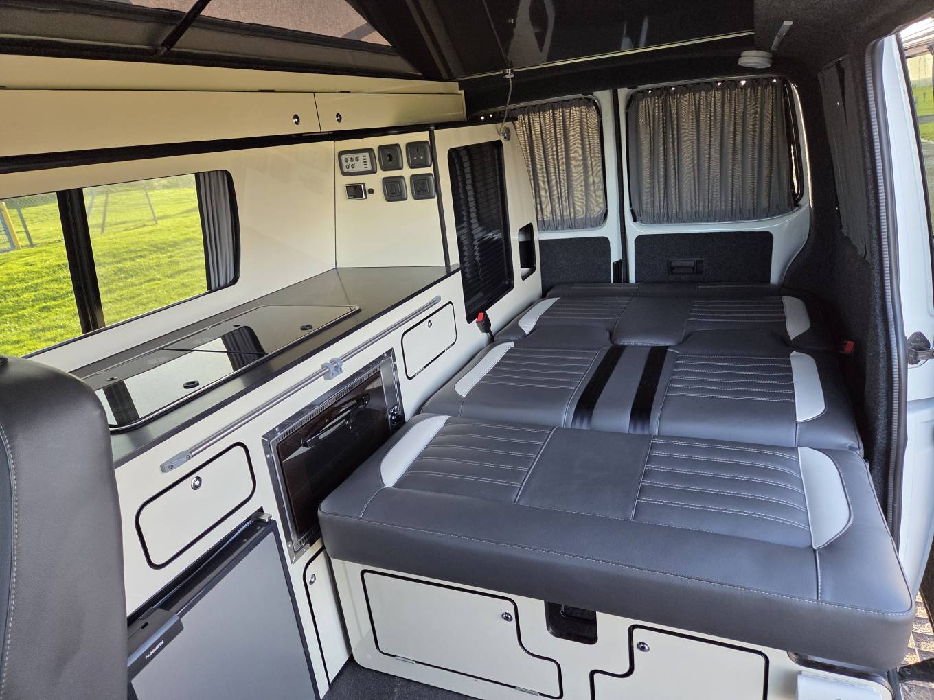 Living: Forward facing double leather seats with belts. Seats convert to a full size ‘Rock & Roll’ double bed with under storage. Foldable dining/work table, ample storage space, LED lighting and shelving.