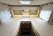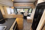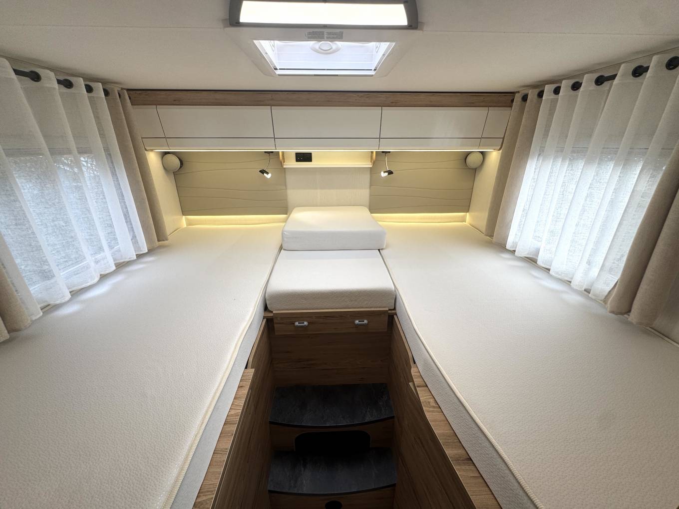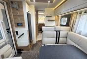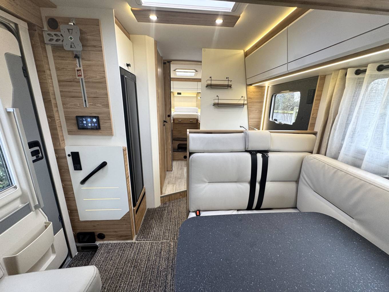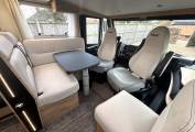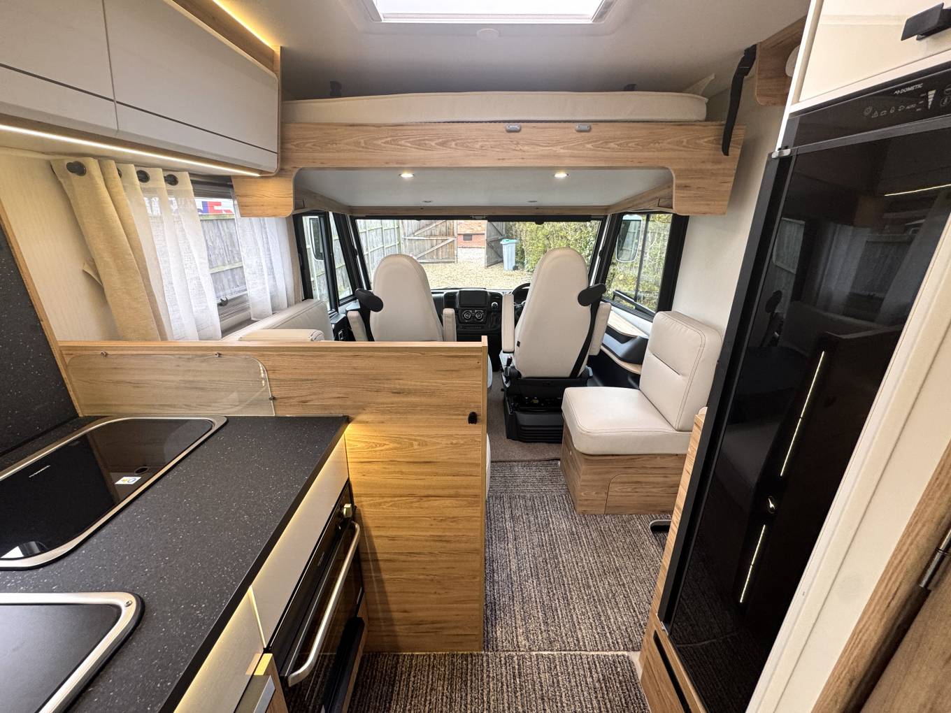 The interior is cleverly designed for comfort and flexibility. At the rear are fixed single beds over the garage, with an infill mattress to create a king-size bed and a dividing door to provide privacy. A drop-down double bed over the cab adds additional sleeping space without compromising daytime living areas. The lounge is open and inviting, offering a versatile seating area that flows into the kitchen and dining space, making it ideal for relaxing, socialising, and family use.