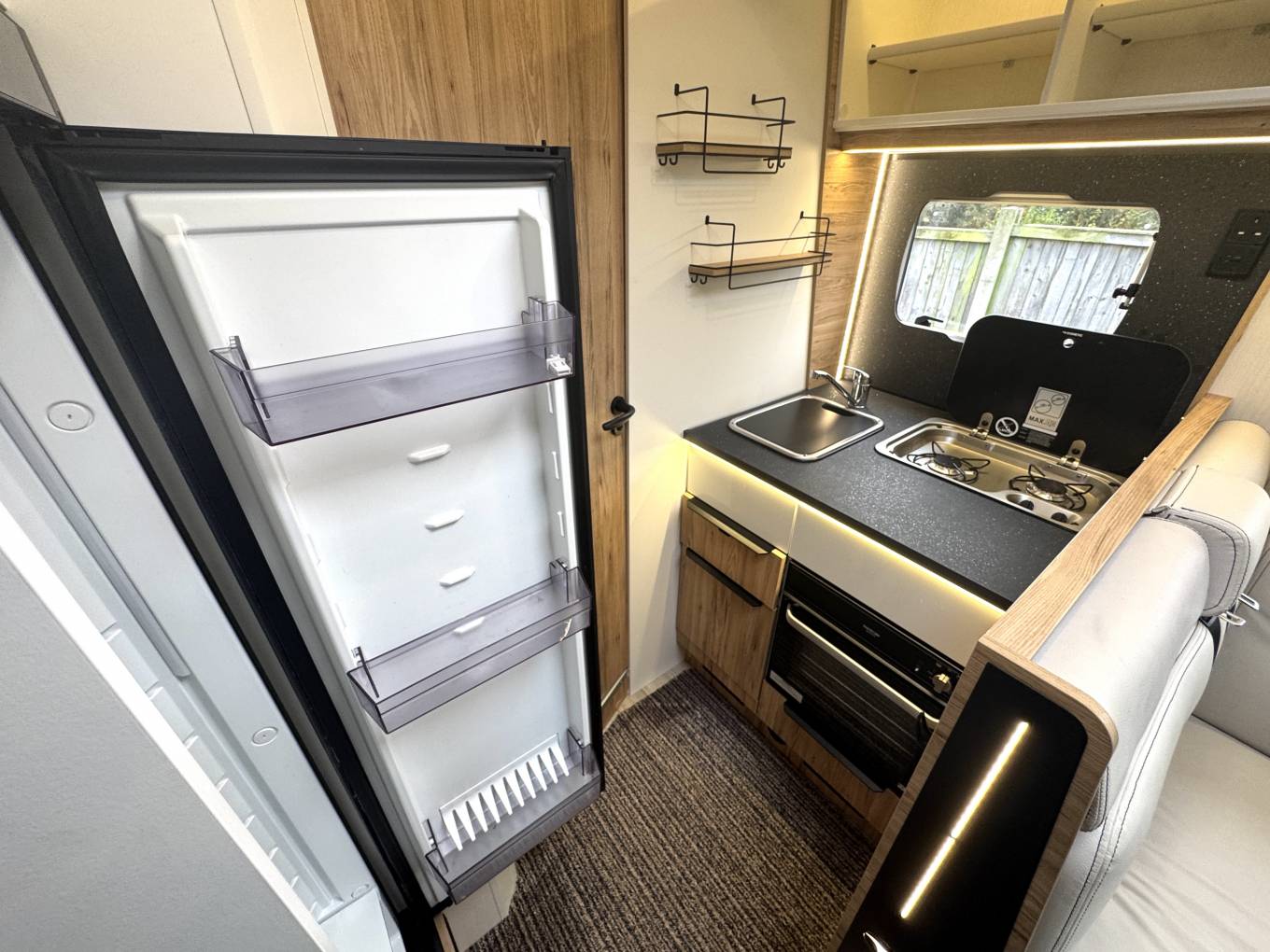 The kitchen is fully equipped with a large Dometic fridge/freezer, 2-burner gas hob with cover, and Thetford gas oven/grill. Heating is via the Truma Combi system and gas is supplied by refillable Gaslow bottles. A waste pipe exiting by the door makes using serviced pitches easy. Touring is made effortless with the E&P ‘Level system’ hydraulic automatic levelling system, complete with remote control for quick and easy setup. Additional extras include a 100w solar panel, Fiamma awning, Thatcham Gemini 931TNH alarm, and custom-fit floor mats. Original manuals for the motorhome and appliances are included.