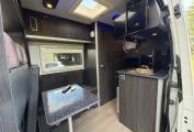 Layout – As you enter the motorhome, you are greeted by the lounge area that converts into a double bed for night time, you have some lovely mood lighting under this area and storage lockers above.