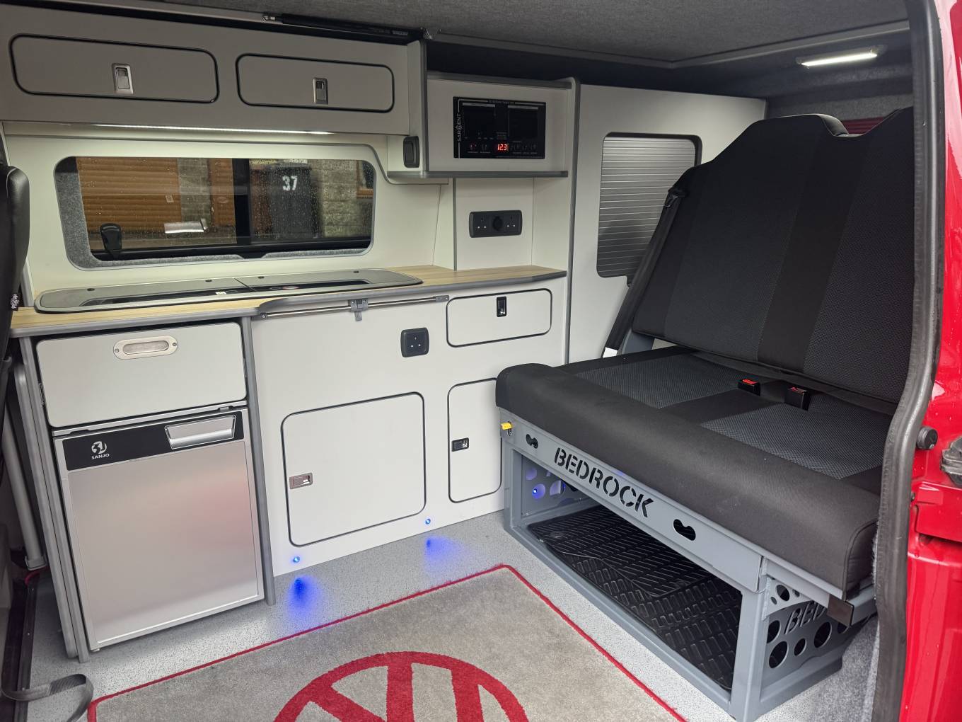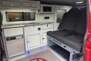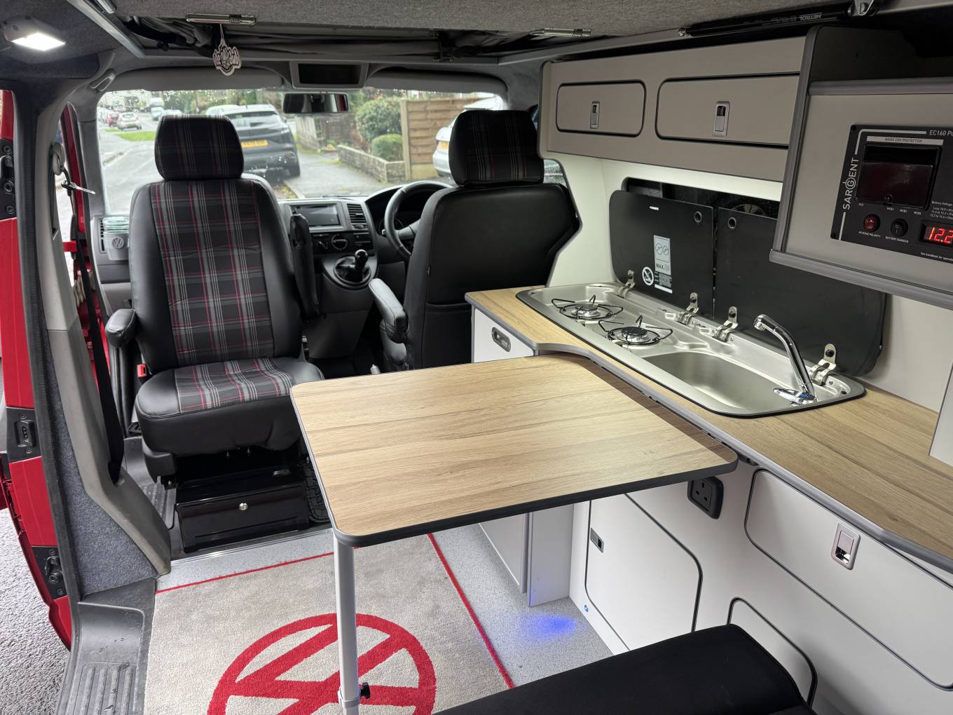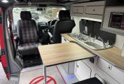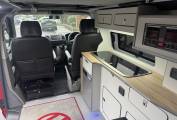 This quality conversion offers a 4 berth sleeping capacity along with 5 travelling seats. The cab which boasts 3 of the travelling seats also has the popular swivel plate so the front passenger seats can turn to face the centre dinette and the remaining 2 travelling seats. In the Cab there is a upgraded Kenwood touch screen interface which includes dab radio, apple/android play and bluetooth phone along with electric windows and mirrors.