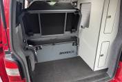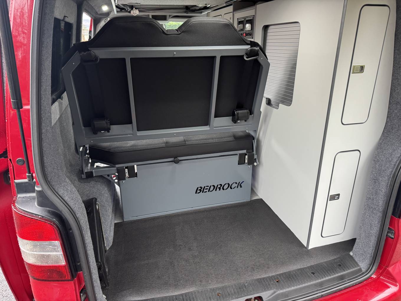 The high specification rock and roll bed has an electric backrest which can be adjusted to ensure maximum comfort when travelling. In order to make the bed, the base slides foward and the back rest electronically lies flat. Above this in the roof is another large double bed and the base of the roof bed also pushes up to allow for more head room when not in use. Around the Camper there are several drawers and storage cupboards so you are never short of space.