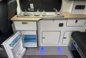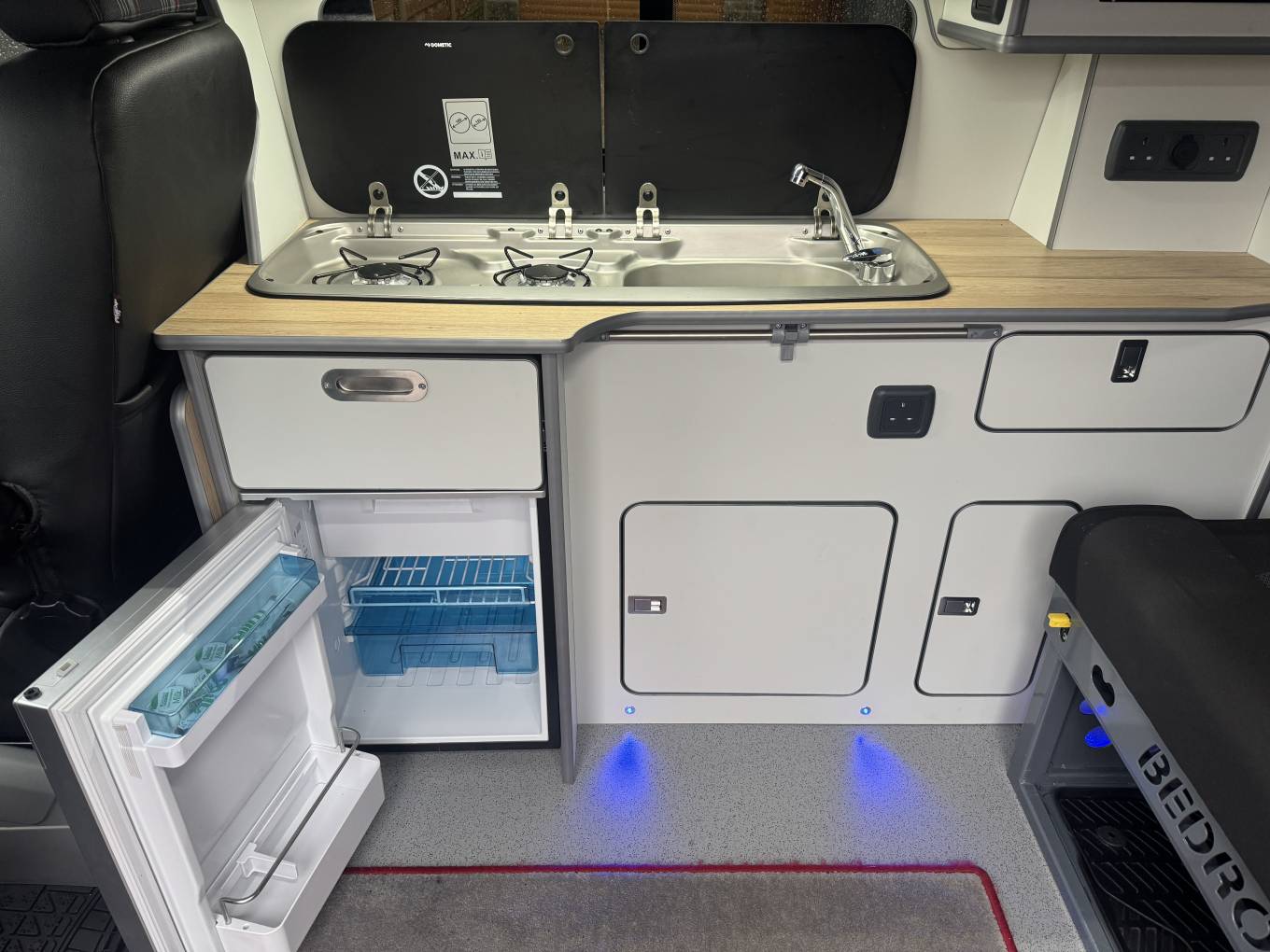 The centre dinette includes a 2 ring gas hob supplied by the gas bottle located underneath in the cupboard. There is also a sink and a good sized fridge with freezer compartment and a dining table which is well positioned between all 5 travelling seats.