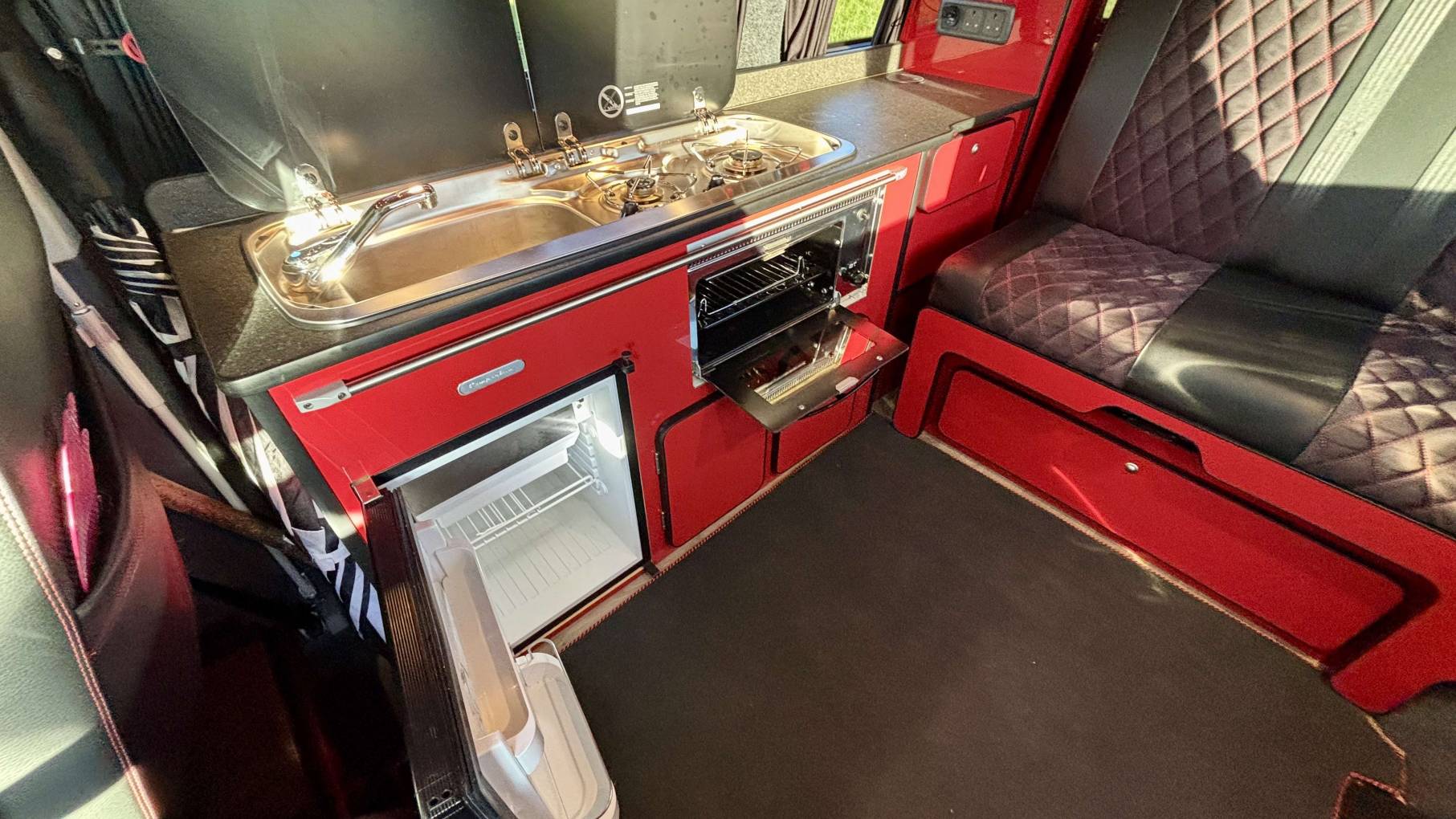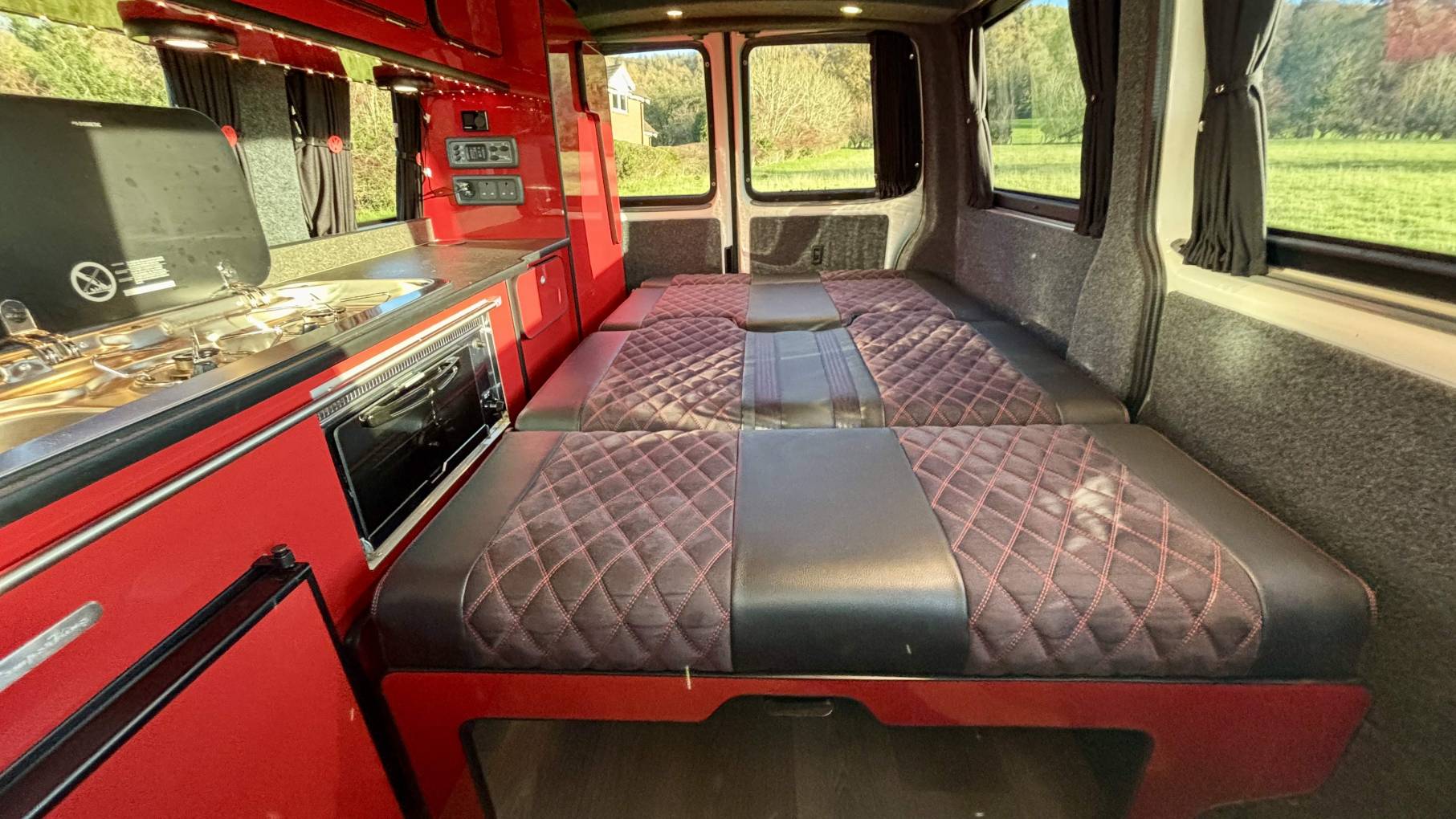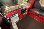 The well-designed kitchen area includes a 2-ring gas hob, grill, sink, and a fridge with freezer box, along with plenty of storage. The double passenger swivel seat provides excellent space utilisation with loads of storage beneath. Two removable tables make the interior ideal for dining or working, while full blackout curtains (including cab) and fitted carpets front and rear create a warm, comfortable living environment.