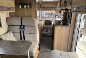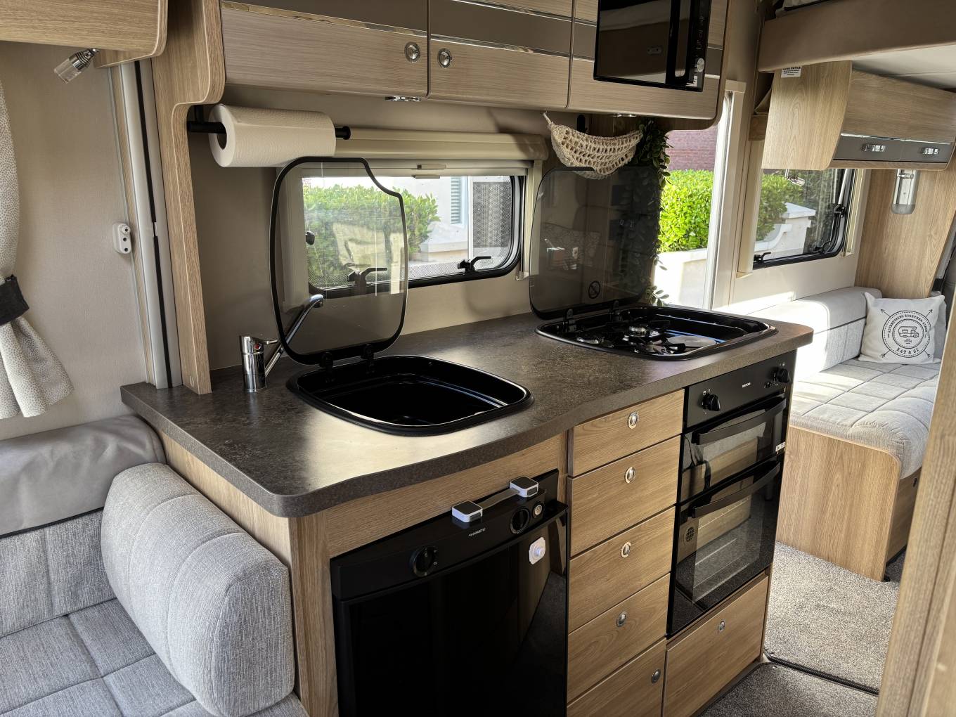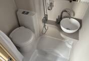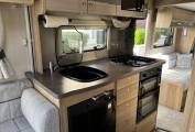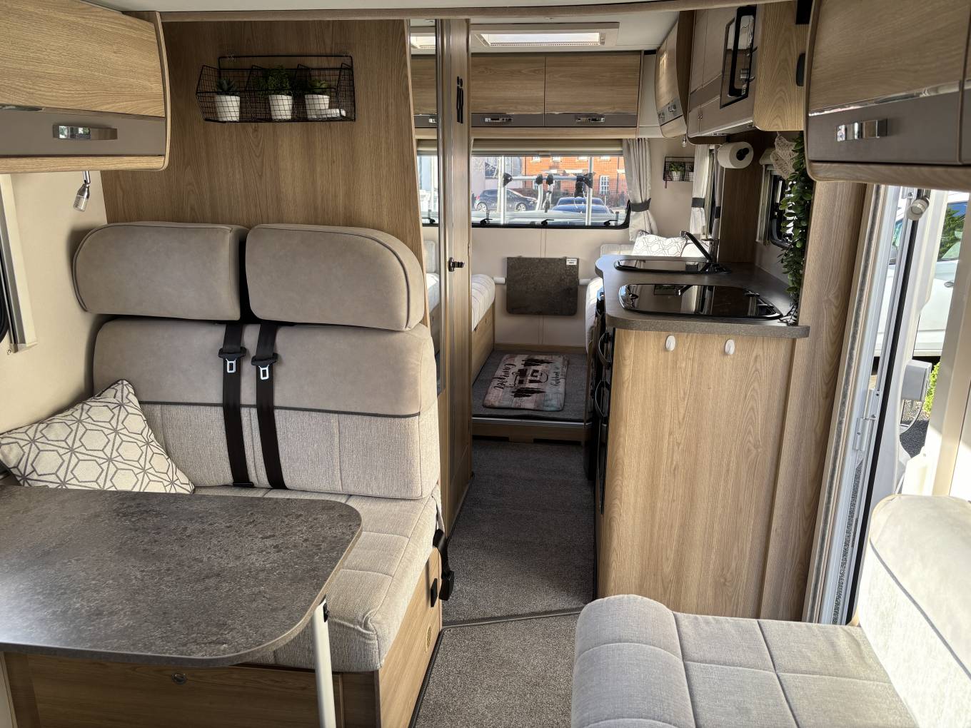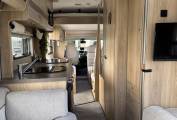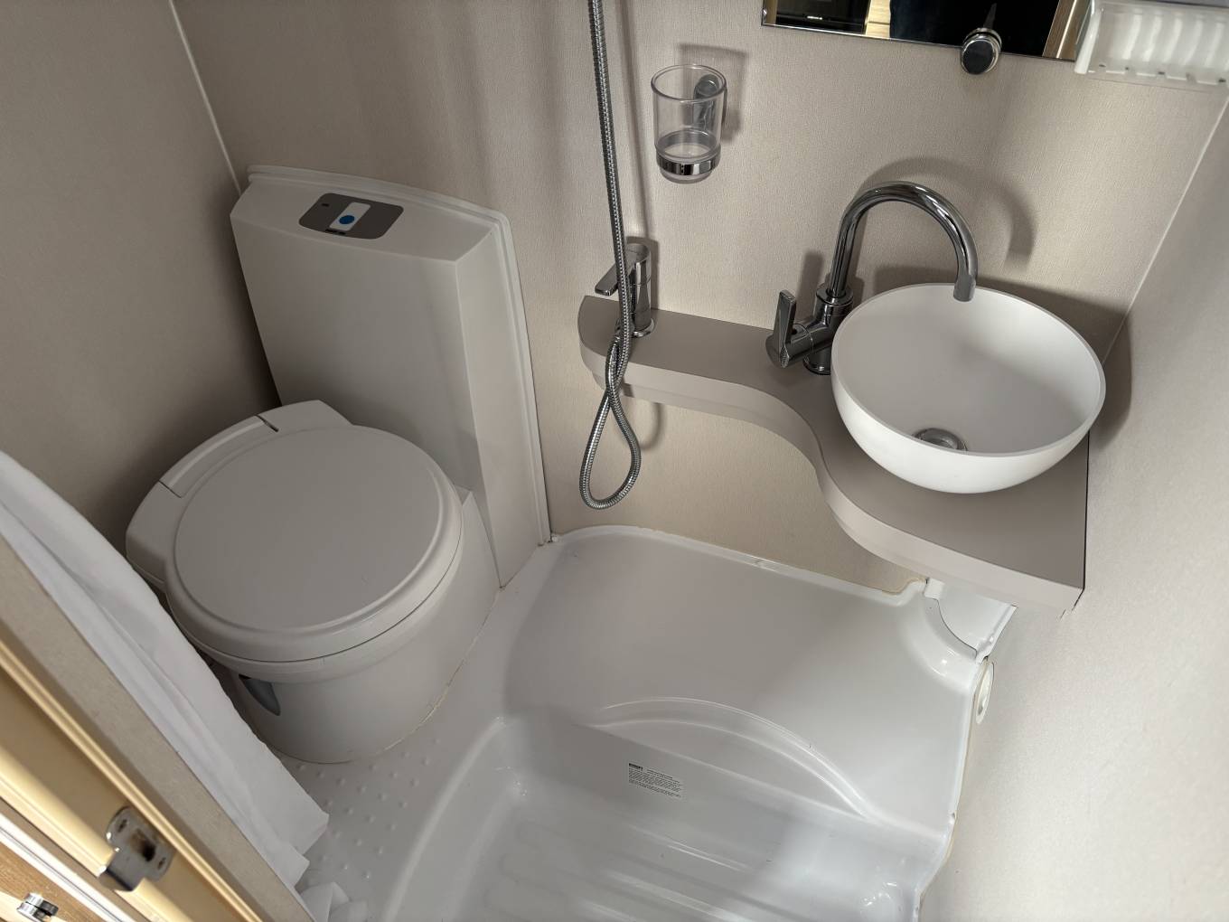 At the heart of the motorhome sits the fully equipped kitchen, complete with sink, oven, grill, microwave, 4 hobs (3 gas, 1 electric) and a 3-way fridge, offering all the essentials for cooking on the go. Opposite is the centre washroom, featuring a toilet, sink, and shower.