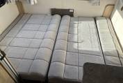 The interior is cleverly designed to maximise comfort and flexibility. At the rear, you’ll find a bright and inviting lounge area that converts into a generous double bed. For added comfort, this space also features a sliding separating panel, allowing you to create a private sleeping area or divide the lounge from the main living space when needed.