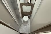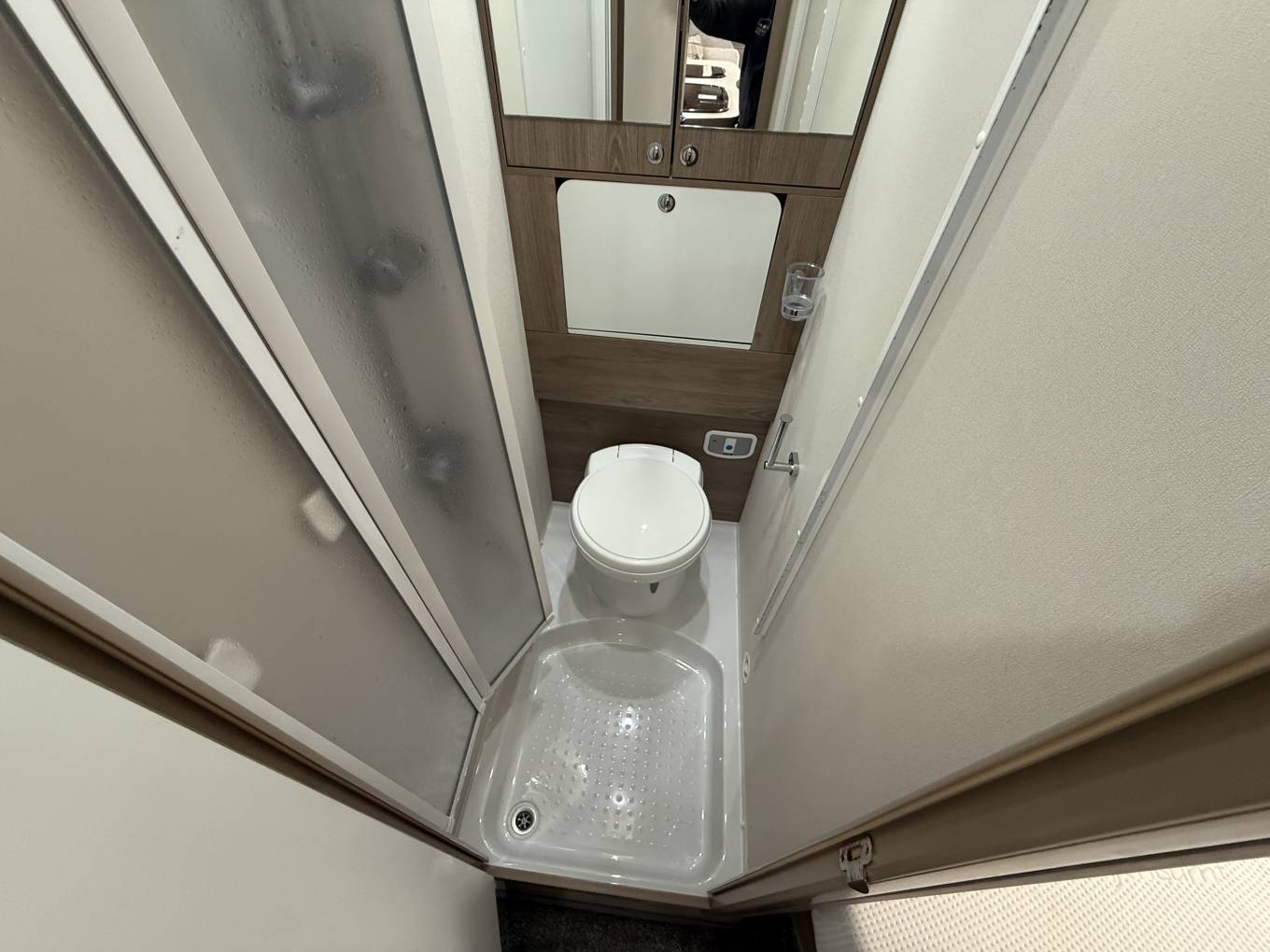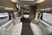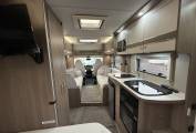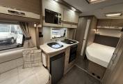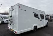 The layout and main feature of this 155 model is its rear fixed French bed with practical storage underneath and above having overhead lockers and within this area a TV is installed. Next to the bed is a functional washroom with toilet cassette, fold down sink and a mixer shower with shower screen. Moving slightly forward in the vehicle is a well equipped kitchen complete with a microwave, oven & grill, 3 ring gas hob, fridge/freezer and sink with mixer tap. To the front of the motorhome is the bright dinette area with 2 fixed bench seats, these benches convert to a large double bed to accommodate another sleeping area and these bench seats also lift to uncover 2-fold out travelling seats and for this area you have a folding table for eating and relaxing.